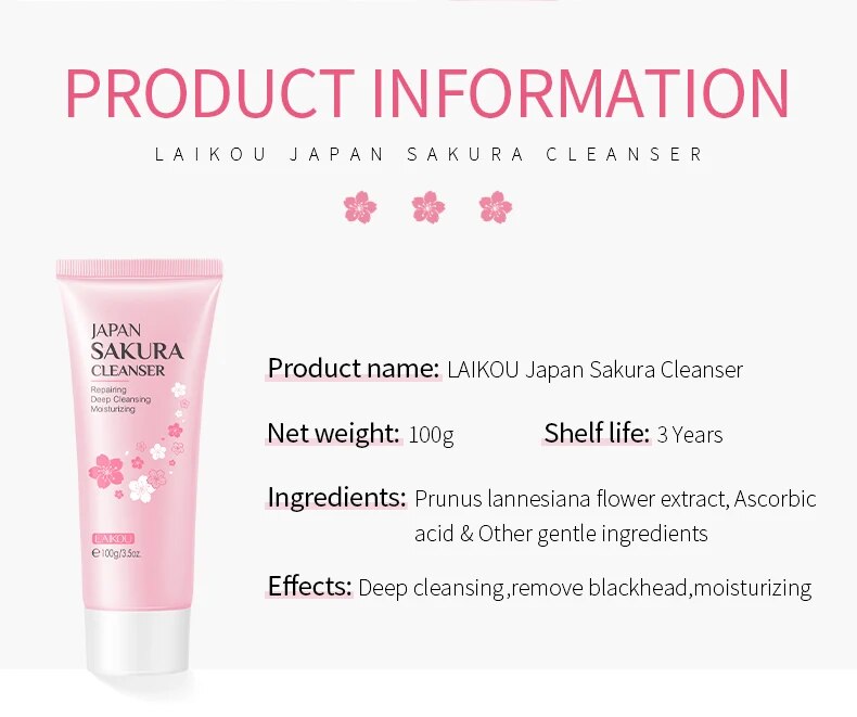 ✨DON'T MISS OUT:LAIKOU Japan Sakura Facial Cleanser Oil Control Cleansing Face Wash Cream Pore Clean 100g PRODUCT PROPERTY:✨ Basic: Brand name is laikou.Type is facial cleanser.Item type is cleanser.Number of pieces is one unit.Origin is cn(origin). ✨ Hardware: Gender is female. REASONS TO BUY:✨ Face washing product: this product is made of high-quality materials, which can be used for a long time. it is very suitable for daily use and does not affect the health of the human body. ✨ Recommended seller: this product is recommended by professional designers, if you have any questions, please feel free to contact us, we will provide timely response. ✨ Best quality: made of high quality material, it is very durable and can be used for a long time. ✨ Deep cleansing: this sakura is designed to help you clean your face and mouth. it can be used as a mask, facial cleanser, skin-friendly cleaning tool, etc.