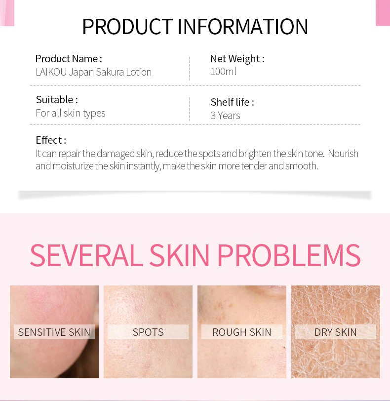 LAIKOU Japan Sakura Lotion প্রুনাস ল্যানেসিয়ানা ফ্লাওয়ার এক্সট্র্যাক্ট এবং নিয়াসিনামাইড সমৃদ্ধ, যা ক্ষতিগ্রস্থ ত্বক মেরামত করতে পারে, দাগ কমাতে পারে এবং ত্বকের স্বর উজ্জ্বল করতে পারে। এটি তাত্ক্ষণিকভাবে ত্বককে পুষ্ট এবং ময়শ্চারাইজ করতে পারে, ত্বককে আরও কোমল এবং মসৃণ করে তুলতে পারে। ত্বককে গভীরভাবে পুষ্ট করে, ত্বক উজ্জ্বল ও মসৃণ করে। প্রধান উপাদান: প্রুনাস ল্যানেশিয়ানা ফুলের নির্যাস। শোষিত করা সহজ এবং অ-চর্বিযুক্ত। তাত্ক্ষণিকভাবে আর্দ্রতা পুনরায় পূরণ করুন। #শরীরে মাখার লোশন