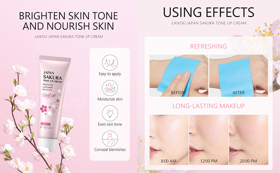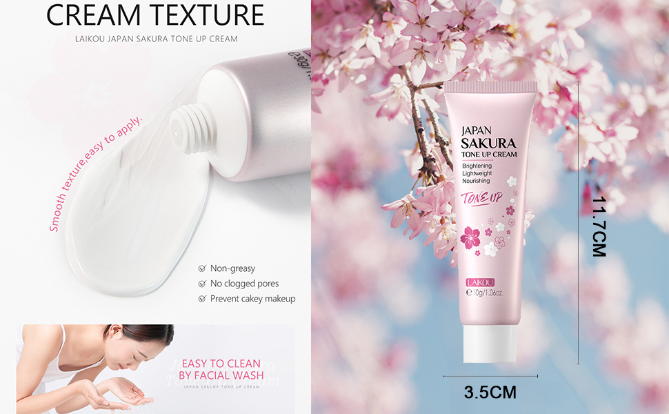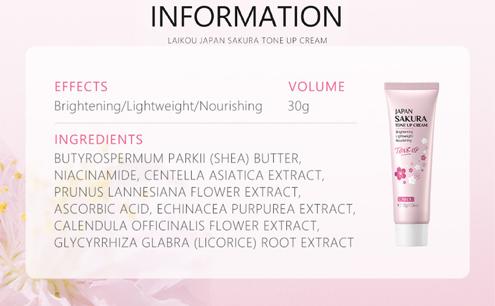 LAIKOU জাপান সাকুরা টোন আপ ক্রিম 30gm নেট: 30 গ্রাম প্রভাব মসৃণ এবং অ-চর্বিযুক্ত টেক্সচারের সাথে, LAIKOU জাপান সাকুরা টোন আপ ক্রিম প্রুনাস ল্যানেসিয়ানা ফ্লাওয়ার এক্সট্র্যাক্ট, সেন্টেলা এশিয়াটিকা এক্সট্র্যাক্ট এবং অনেক ভেষজ নির্যাস সমৃদ্ধ, যা দাগ লুকিয়ে রাখতে পারে, ত্বকের টোন উজ্জ্বল করতে পারে এবং ত্বককে পুষ্ট করতে পারে। নিয়াসিনামাইড এবং ভিটামিন সি ধারণ করে, এটি ত্বকের নিস্তেজতা এবং অক্সিডেশন কমাতে পারে, ত্বককে সূক্ষ্ম এবং চকচকে করে তোলে। ব্যবহার ত্বকের যত্নের শেষ ধাপে, আপনার মুখে যথাযথ পরিমাণে টোন আপ ক্রিম নিন, সমানভাবে ছড়িয়ে দিন এবং আপনার ত্বকে এটি শোষিত না হওয়া পর্যন্ত ম্যাসেজ করুন।