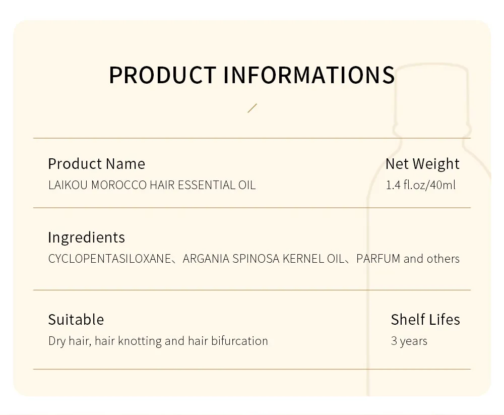 LAIKOU মরক্কো হেয়ার এসেনশিয়াল অয়েল 40ml - ক্ষতিগ্রস্থ চুল মেরামত করুন মসৃণ শুষ্ক চুল পুষ্টি প্রদান করে চুলকে মসৃণ এবং সিল্কি করে। ❀Brand❀ LAIKOU ❀ উৎপত্তি ❀ চীন ❀শেল্ফ লাইফ 3 বছর ❀ ভলিউম 40 মিলি ❀প্যাকেজ অন্তর্ভুক্ত ❀ 1*1pc LAIKOU মরক্কো হেয়ার এসেনশিয়াল অয়েল 40ml ❀ প্রধান উপাদান ❀ সাইক্লোপেন্টাসিলক্সেন, ডাইমেথিকোন, আইসোডোডেকেন, আইসোহেক্সাডেকেন, ডাইমেথিকোনল, আর্গানিয়া স্পিনোসা কার্নেল অয়েল, পারফাম ❀ প্রভাব ❀ LAIKOU মরক্কো হেয়ার এসেনশিয়াল অয়েল মরোক্কো আরগান তেলে সমৃদ্ধ, যা ক্ষতিগ্রস্থ চুল মেরামত করতে পারে, শুষ্ক চুলকে মসৃণ করতে পারে এবং সূর্যের আলো এবং অন্যান্য ক্ষতিকারক পদার্থের ক্ষতি থেকে চুলকে রক্ষা করার জন্য একটি প্রতিরক্ষামূলক ফিল্ম তৈরি করতে পারে। এটি কার্যকরভাবে চুল মেরামত করতে পারে এবং চুলকে মসৃণ এবং সিল্কি করতে পুষ্টি প্রদান করতে পারে। ❀ব্যবহার শ্যাম্পু করার পরে, যথাযথ পরিমাণে চুলের তেল নিন এবং আপনার চুলে সমানভাবে প্রয়োগ করুন, তারপরে এটি শোষিত না হওয়া পর্যন্ত আলতোভাবে ম্যাসাজ করুন এবং এটি ধুয়ে ফেলতে হবে না। ❀সাবধান △ সংবেদনশীল ত্বক ব্যবহারের আগে কানের পিছনে পরীক্ষা করা উচিত। জ্বালা অনুভূতি দেখা দিলে এটি ব্যবহার বন্ধ করুন। △ এটি শিশুদের নাগালের বাইরে রাখুন △ সঞ্চয়স্থান: এটিকে ঠান্ডা জায়গায় রাখুন এবং সরাসরি সূর্যের এক্সপোজার এড়াতে হবে।