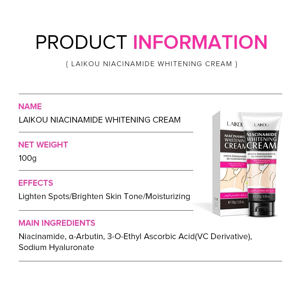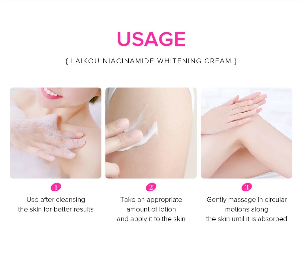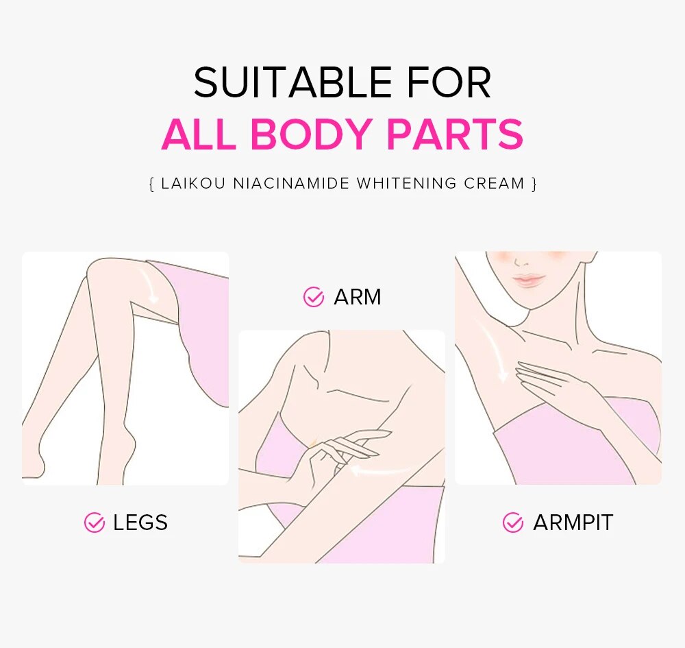 LAIKOU নিয়াসিনামাইড হোয়াইটিং বডি ক্রিম আন্ডারআর্ম নী রিডুস পিগমেন্টেশন 100 গ্রাম নেট: 100 গ্রাম প্রভাব: স্কিন টোন উজ্জ্বল করুন/দাগ হালকা করুন/ময়শ্চারাইজিং প্রধান উপাদান: Niacinamide, Sodium Hyaluronate, Alpha-Arbutin বৈশিষ্ট্য 1. বিপাক ত্বরান্বিত করুন নিয়াসিনামাইডে ছোট অণু থাকে, যা ত্বকের কোষের বিপাককে ত্বরান্বিত করতে পারে এবং বলিরেখা মসৃণ করে। 2. কোলাজেন সংশ্লেষণ প্রচার করুন এটি কোলাজেনের সংশ্লেষণকে উন্নীত করতে পারে এবং ত্বকের স্থিতিস্থাপকতা পুনরুদ্ধার করতে পারে 3. এন্টি-গ্লাইকেশন প্রভাব এটি গ্লাইকেশন প্রতিরোধ করতে পারে যাতে দাগ রোধ করতে পারে এবং ত্বকের নিস্তেজতা কমাতে পারে। 4. বিবর্ণ দাগ নিয়াসিনামাইড মুক্ত র্যাডিকেলগুলিকে মেরে ফেলতে পারে, গাঢ় দাগ এবং এমনকি ত্বকের টোনকে হালকা করতে পারে। কিভাবে ব্যবহার করে পরিষ্কার করার পরে, ত্বকে ক্রিমটি লাগান এবং এটি শোষিত না হওয়া পর্যন্ত আলতোভাবে ম্যাসাজ করুন। প্যাকেজ: 1 x নিয়াসিনামাইড হোয়াইটনিং বডি ক্রিম
