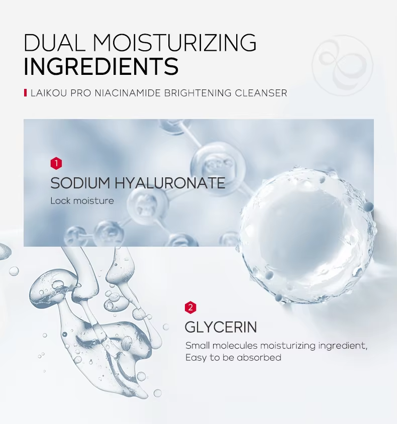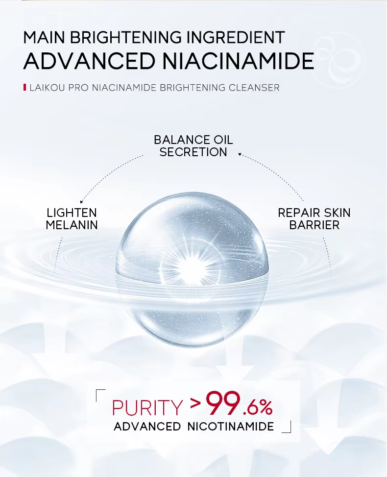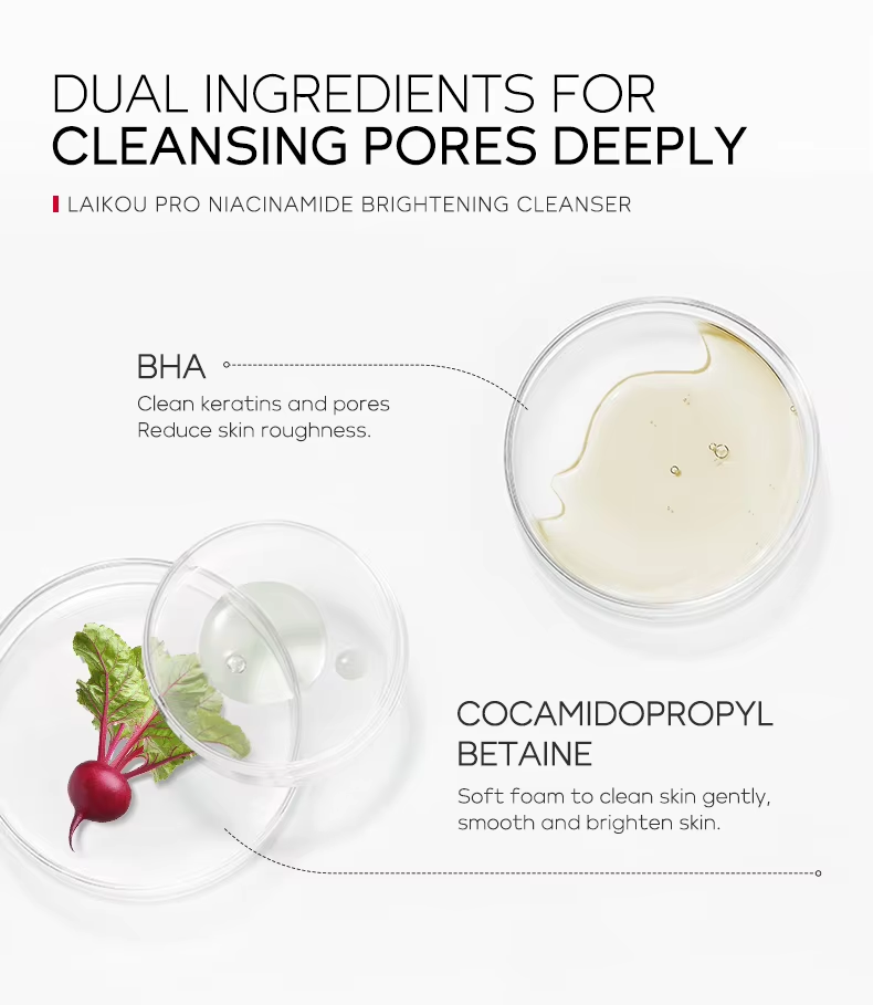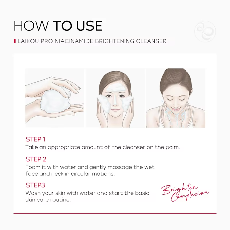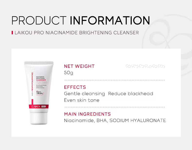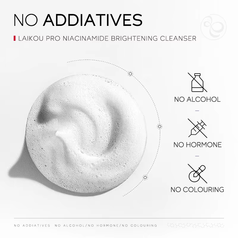 Laikou Whitening Soothing Cleanser contains Centella Asiatica Extract, which can deeply clean grease and get rid of the dirt in the pores, soothe acne and oily skin. With the ingredients of Hyaluronic Acid, Niacinamide and Dipotassium Glycyrrhizate, it can strengthen the skin barrier and reduce skin moisture loss, making skin hydrated.