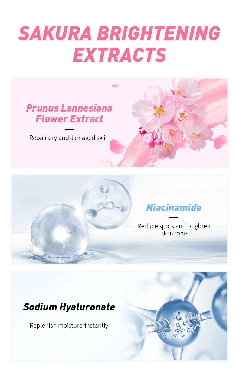 প্রকার: সাকুরা আই ক্রিম 15 গ্রাম সাকুরা সিরাম 17 মিলি সাকুরা ক্রিম 25 গ্রাম সাকুরা ক্লিঞ্জার 50 গ্রাম সাকুরা টোনার 100 মিলি সাকুরা সান ক্রিম এসপিএফ 50 বৈশিষ্ট্য এটি ত্বককে উজ্জ্বল করতে পারে এবং ক্ষতিগ্রস্থ ত্বক মেরামত করতে পারে এবং ছিদ্র পরিষ্কার করতে পারে, ময়লা তৈরি করতে পারে আপনার ত্বককে পরিষ্কার এবং উজ্জ্বল করে এবং মরা ত্বককে গভীরভাবে পরিষ্কার করে কোষ