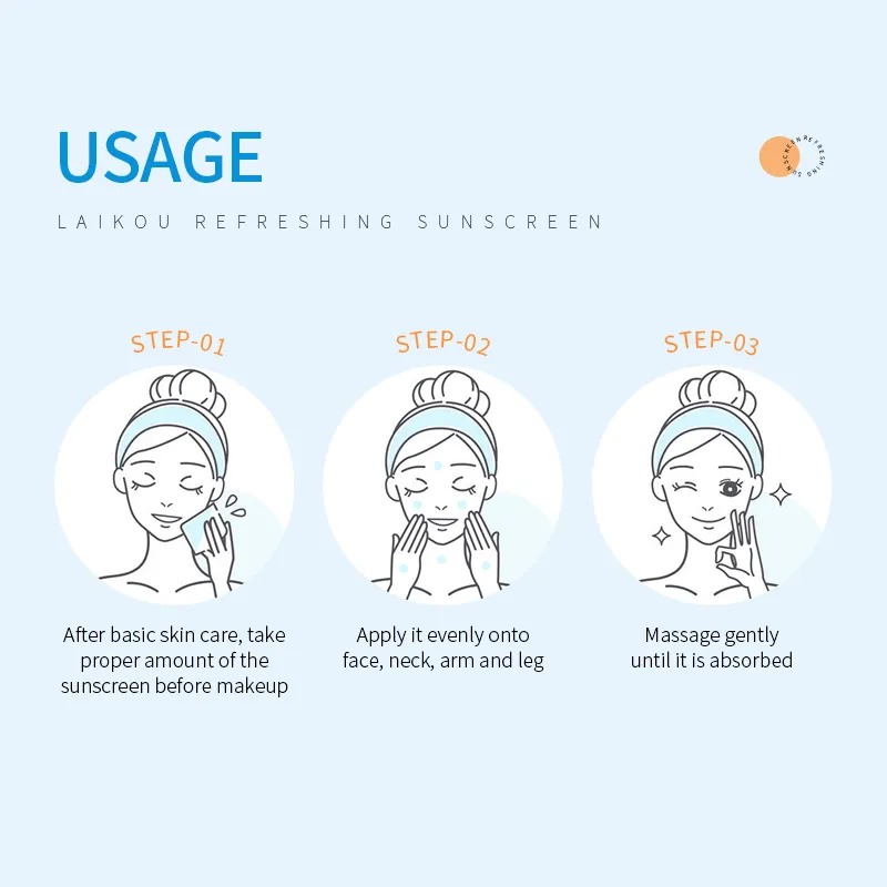 How to useApply proper amount of the sunscreen onto face, neck, arm and leg evenly before make up or going outside, massage gently until it is absorbed.