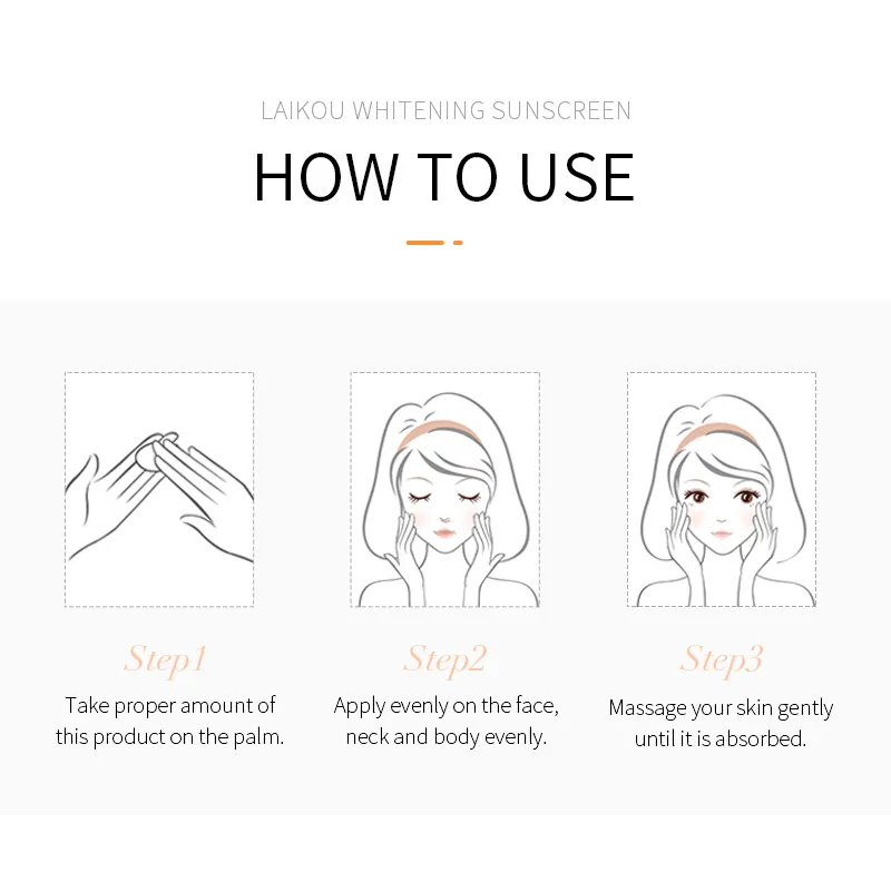 How to use:Apply proper amount of the sunscreen onto face, neck, arm and leg evenly before make up or going outside, massage gently until it is absorbed.