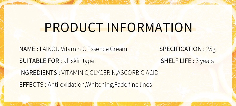 LAIKOU ভিটামিন সি এসেন্স ক্রিম ফ্রেকল ময়শ্চারাইজিং ক্রিম 25 গ্রাম অপসারণ করুন LAIKOU ভিটামিন সি এসেন্স ক্রিম ফ্রেকল ময়শ্চারাইজিং ক্রিম 25 গ্রাম অপসারণ করুন বৈশিষ্ট্য রুক্ষ ত্বকের অবস্থার উন্নতি, হাইড্রেট এবং ত্বক ময়শ্চারাইজ করুন ত্বকের টোন উজ্জ্বল করুন এবং ক্ষতিগ্রস্ত ত্বক মেরামত করুন সারা রাত আপনার ত্বককে ময়শ্চারাইজ করুন, মুখের তেল নিঃসরণকে ভারসাম্য রাখুন হালকা এবং সূক্ষ্ম জমিন, চামড়া স্তর মধ্যে পশা স্পেসিফিকেশন: নাম: ফেস ক্রিম নেট ওজন: 25 গ্রাম শেলফ লাইফ: 3 বছর প্যাকেজ অন্তর্ভুক্ত: 1*ফেস ক্রিম সতর্কতা: 1. এই পণ্যটি বেশিরভাগ ত্বকের জন্য উপযুক্ত। যাইহোক, যদি আপনি অস্বস্তি বোধ করেন, অনুগ্রহ করে অবিলম্বে এটি ব্যবহার বন্ধ করুন 2. অনুগ্রহ করে আহত ত্বকে এটি প্রয়োগ করবেন না 3. সংবেদনশীল ত্বকের জন্য, পুরো মুখে ব্যবহারের আগে ত্বক পরীক্ষা করুন