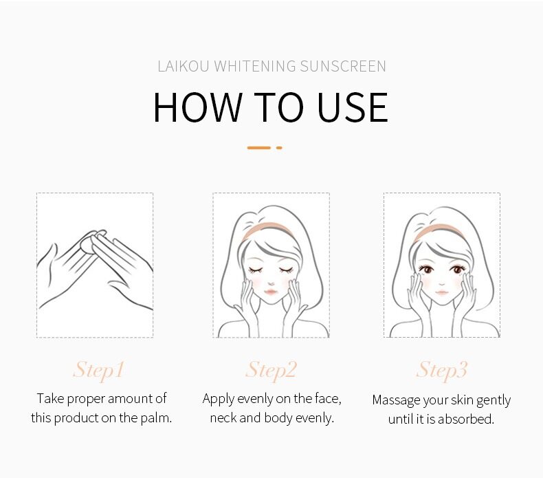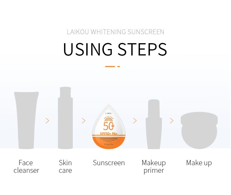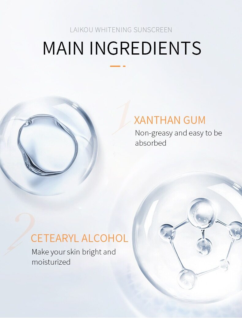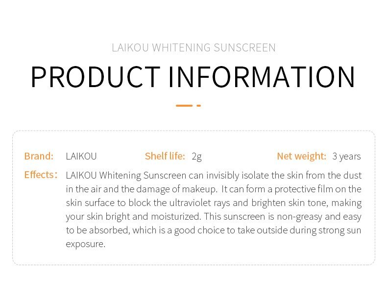 LAIKOU ঝকঝকে সানস্ক্রিন বাতাসের ধুলো এবং মেকআপের ক্ষতি থেকে ত্বককে অদৃশ্যভাবে বিচ্ছিন্ন করতে পারে। এটি অতিবেগুনী রশ্মিকে অবরুদ্ধ করতে এবং ত্বকের স্বরকে উজ্জ্বল করতে ত্বকের পৃষ্ঠে একটি প্রতিরক্ষামূলক ফিল্ম তৈরি করতে পারে, আপনার ত্বককে উজ্জ্বল এবং ময়শ্চারাইজ করে। এই সানস্ক্রিন অ-চর্বিযুক্ত এবং শোষিত করা সহজ, যা শক্তিশালী সূর্যের এক্সপোজারের সময় বাইরে নেওয়া একটি ভাল পছন্দ।