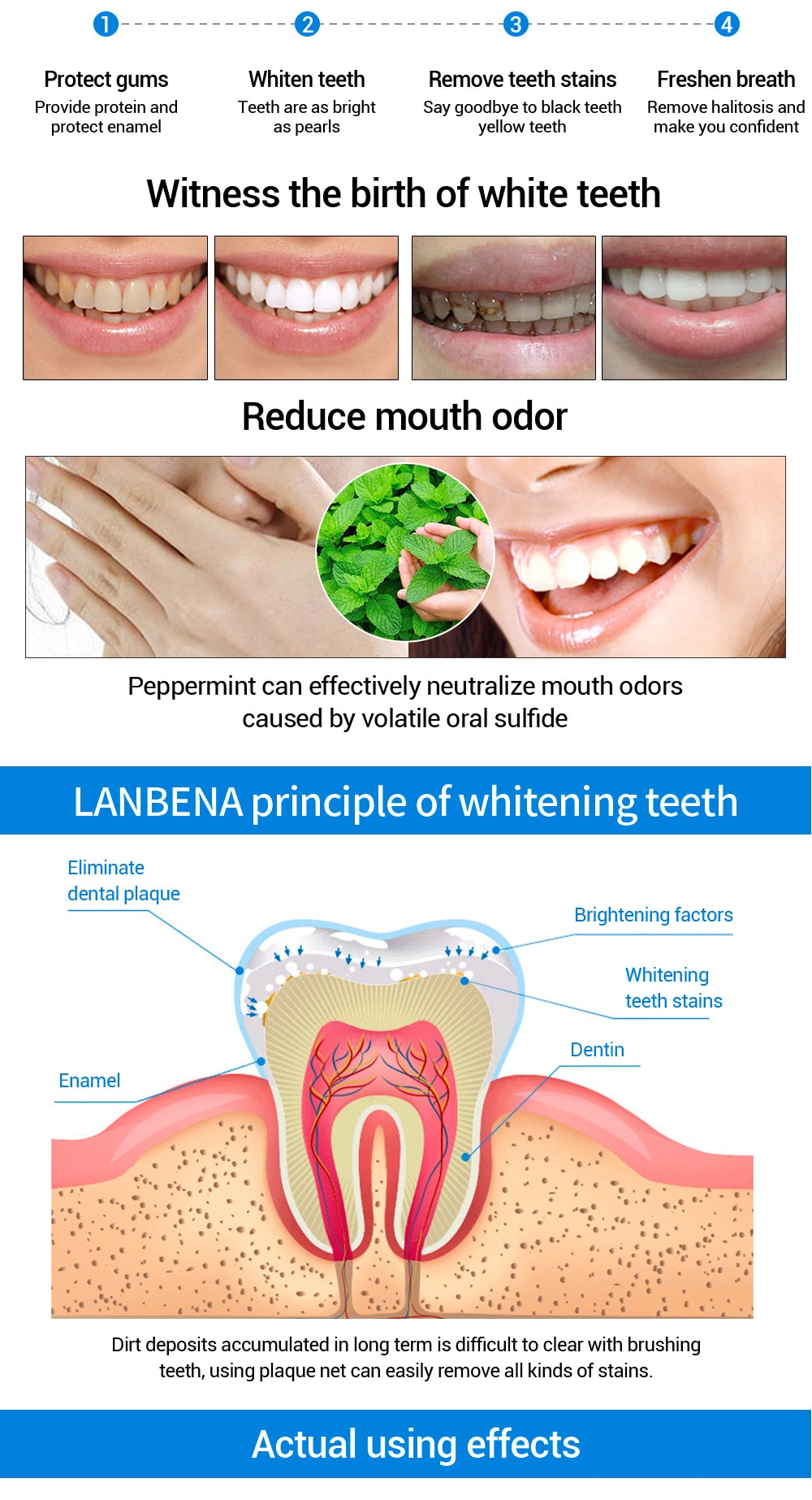 Removes the stains resulted from smoking and drinking tea or tea in a more effective way,whitens yellow teeth completely and sweeps away plaque for a full clean-mouth experience