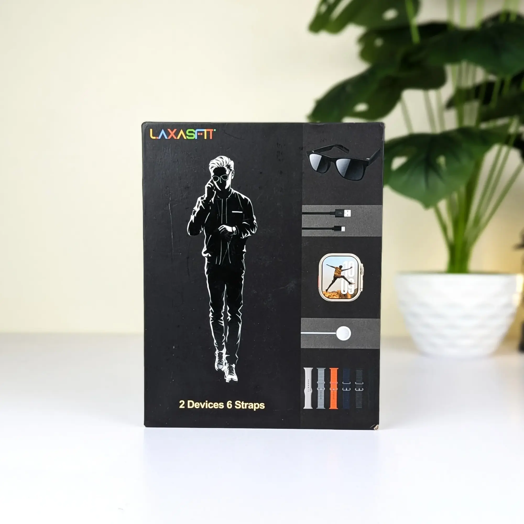 LAXASFIT Smartwatch Set – 2 Devices with 6 StrapsPackage Contents1 × Smartwatch1 × Smart Sunglasses6 × Interchangeable StrapsKey FeaturesSmart SunglassesCharging Time: 1–2 hoursCharging Type: USB Type-CDesign: Stylish and lightweightAudio System: Built-in speakersConnectivity: Bluetooth for hands-free callingAdditional Features: Play music, answer calls, and protect your eyes with UV and blue-light filtering lensesSmartwatchCharging Type: Magnetic wireless chargeDisplay: Full-color touch displayNotifications: Shows messages, calls, and app notificationsHealth & Fitness Tracking: Heart rate monitoring, step counter, sleep tracking, and activity remindersCompatibility: Works with both Android and iOS devices