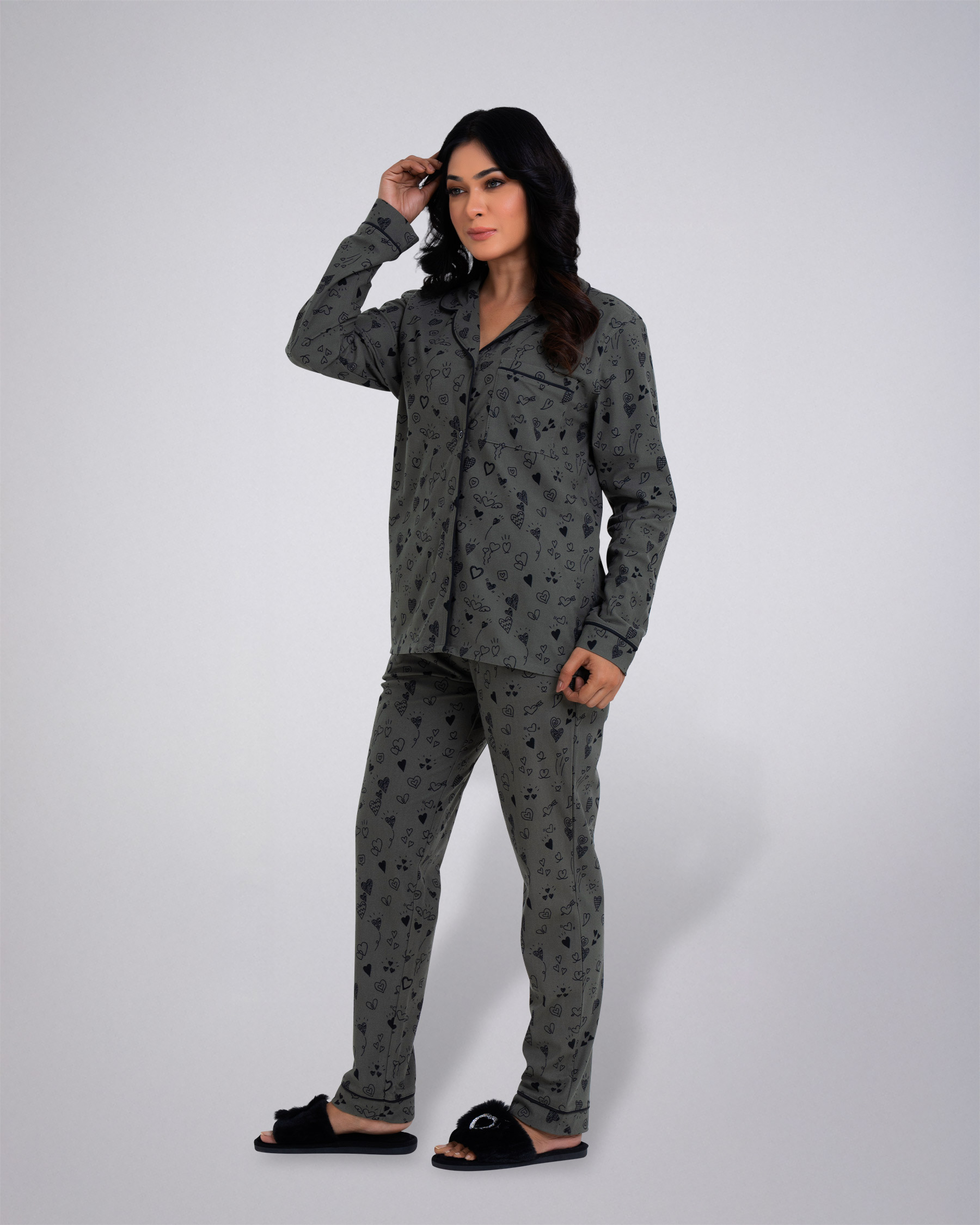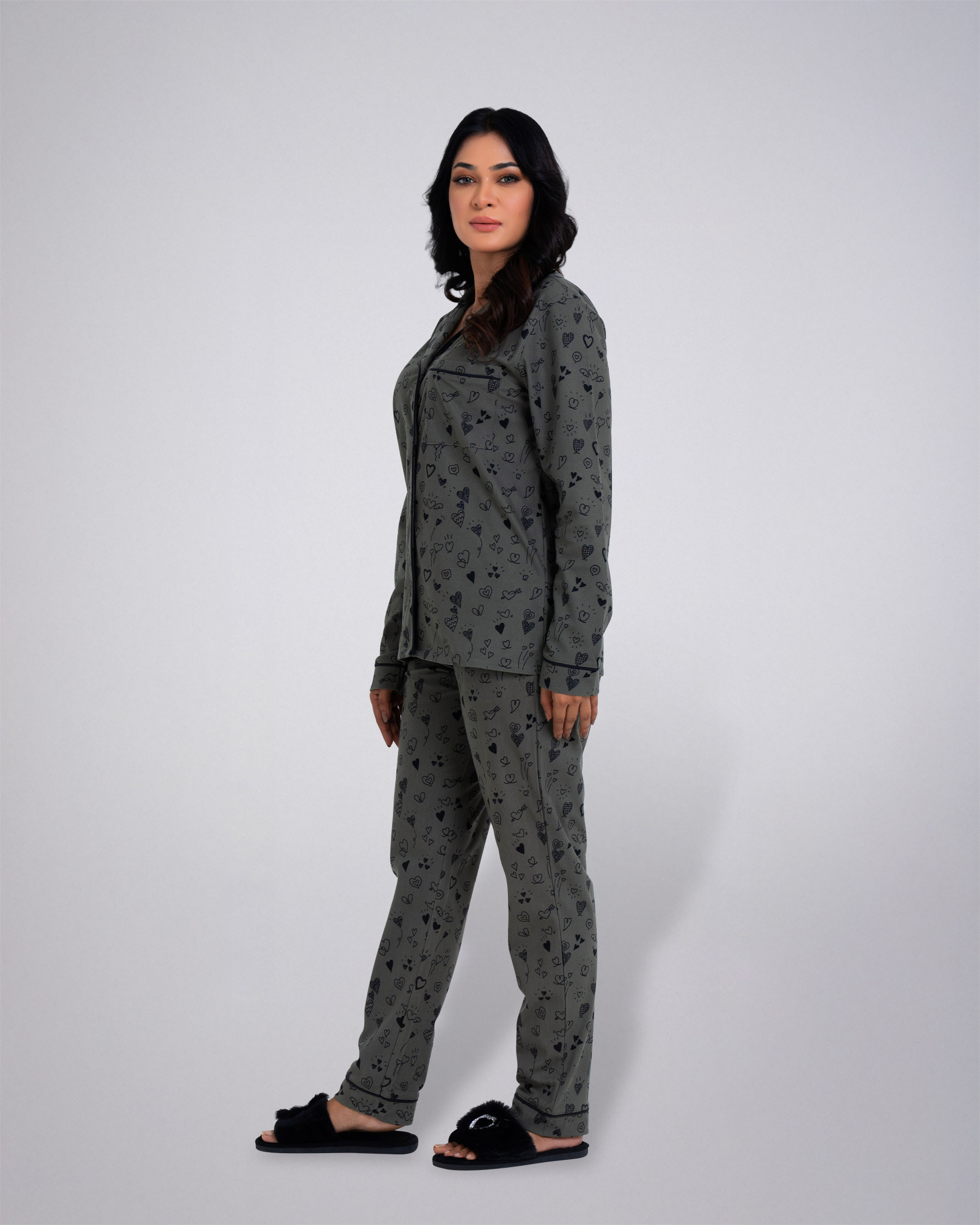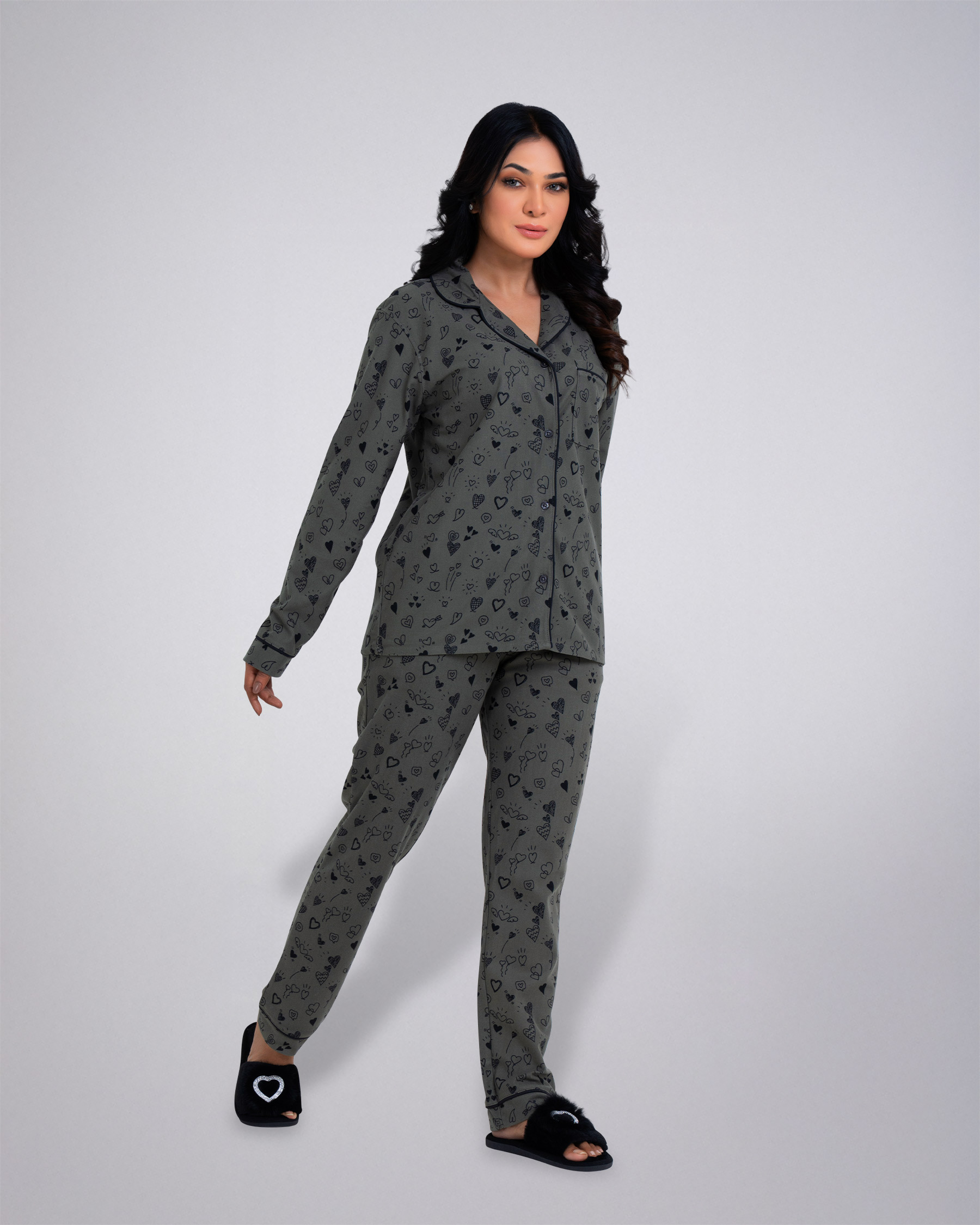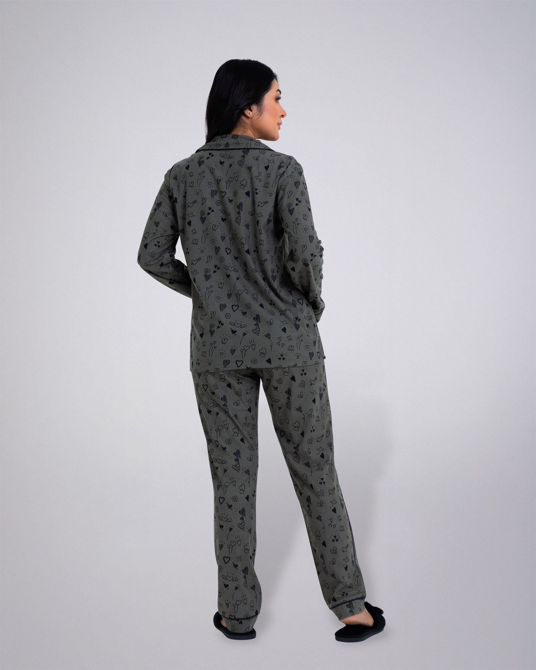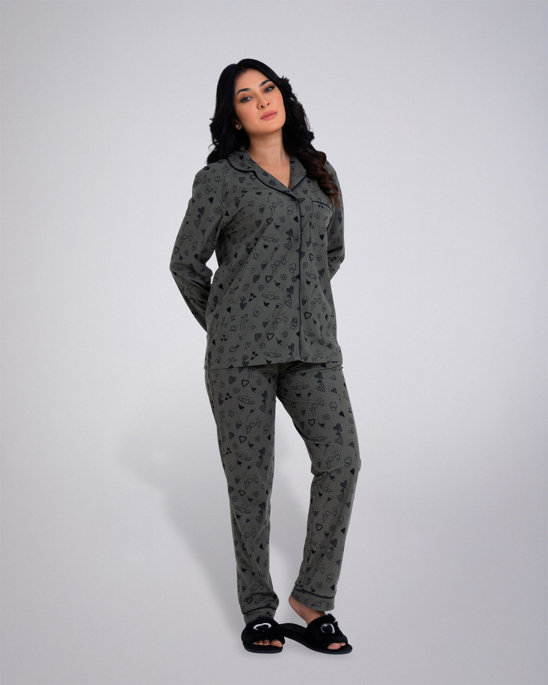The set features a classic long-sleeve shirt with a stylish collar and button-down front, complete with a convenient chest pocket. The matching trouser comes with an elastic waistband and an adjustable drawstring, providing a perfect and secure fit. The contrast piping detail adds a touch of elegance to this simple yet chic design. Whether you're unwinding after a long day or enjoying a lazy weekend morning, this pajama set is your go-to choice. Its durable material ensures long-lasting wear, while the easy-care fabric makes it a practical addition to your wardrobe.