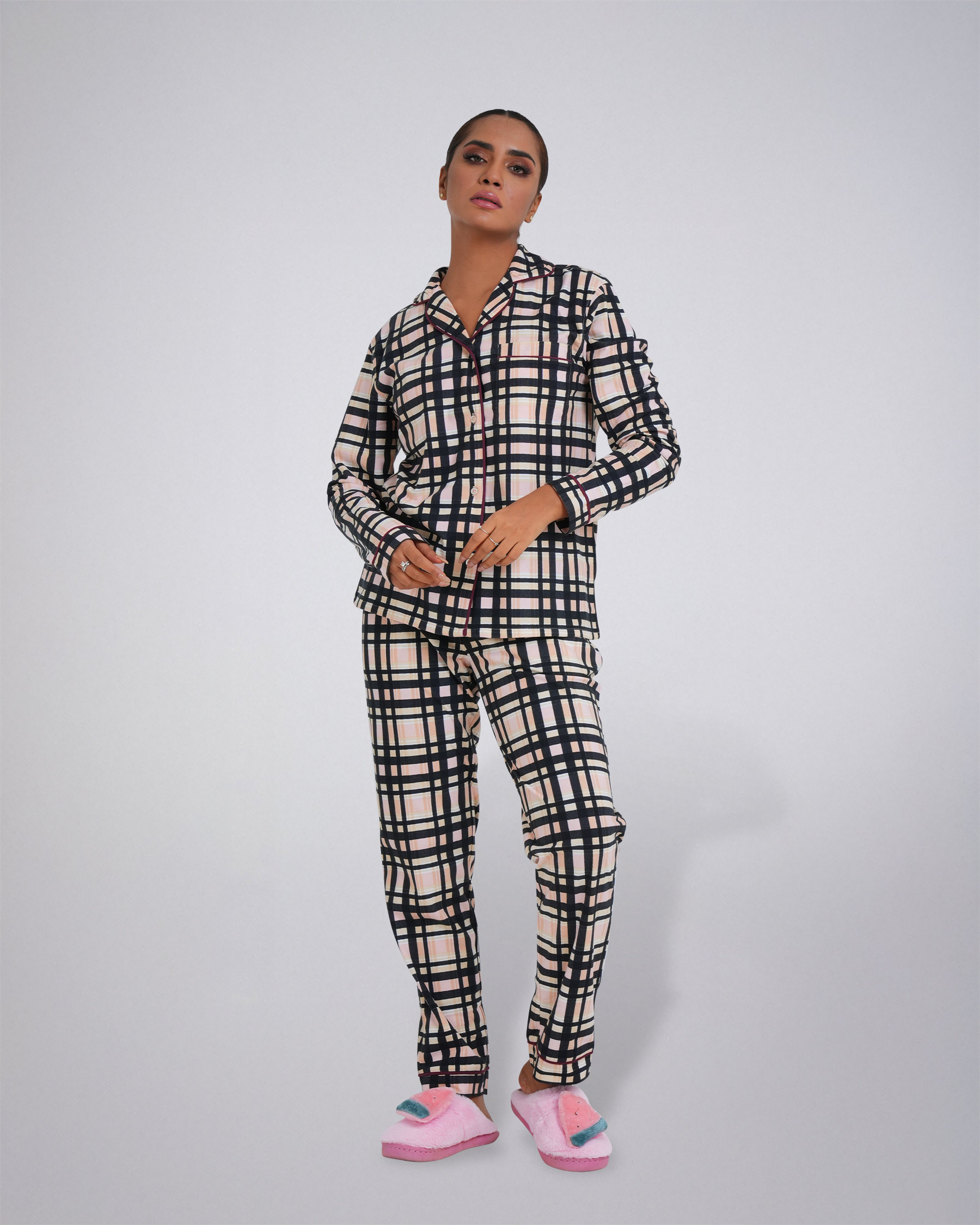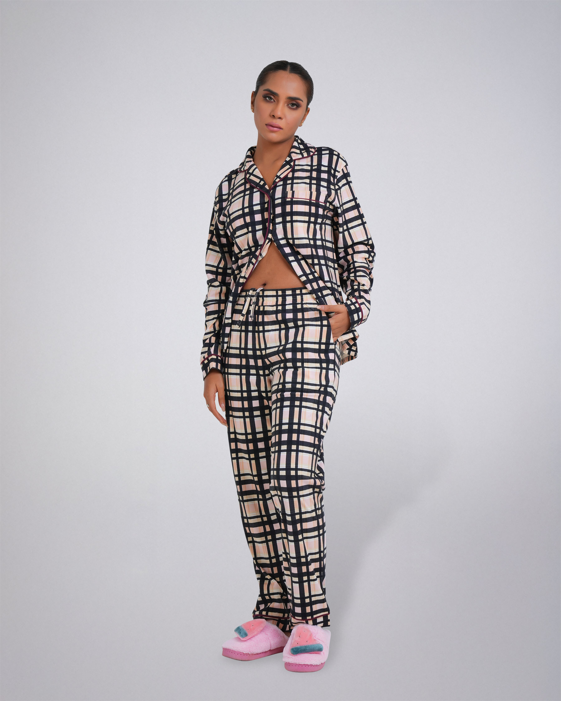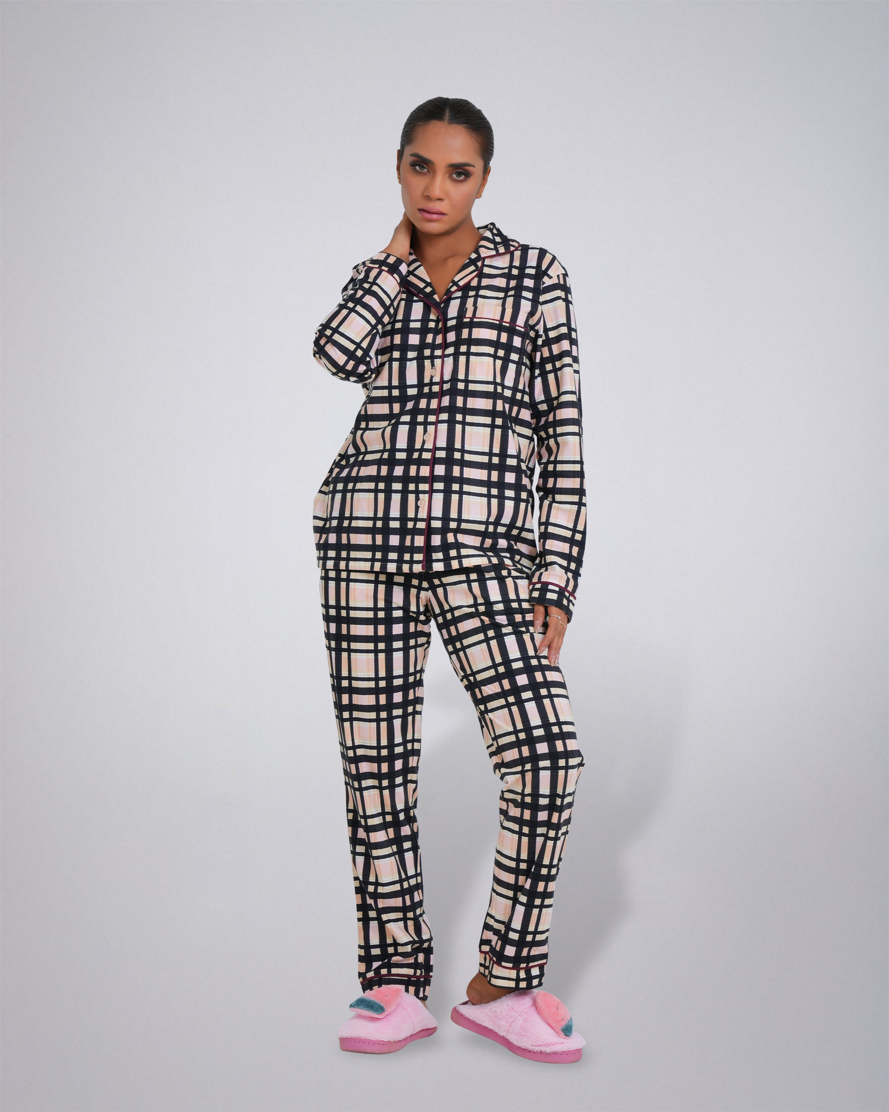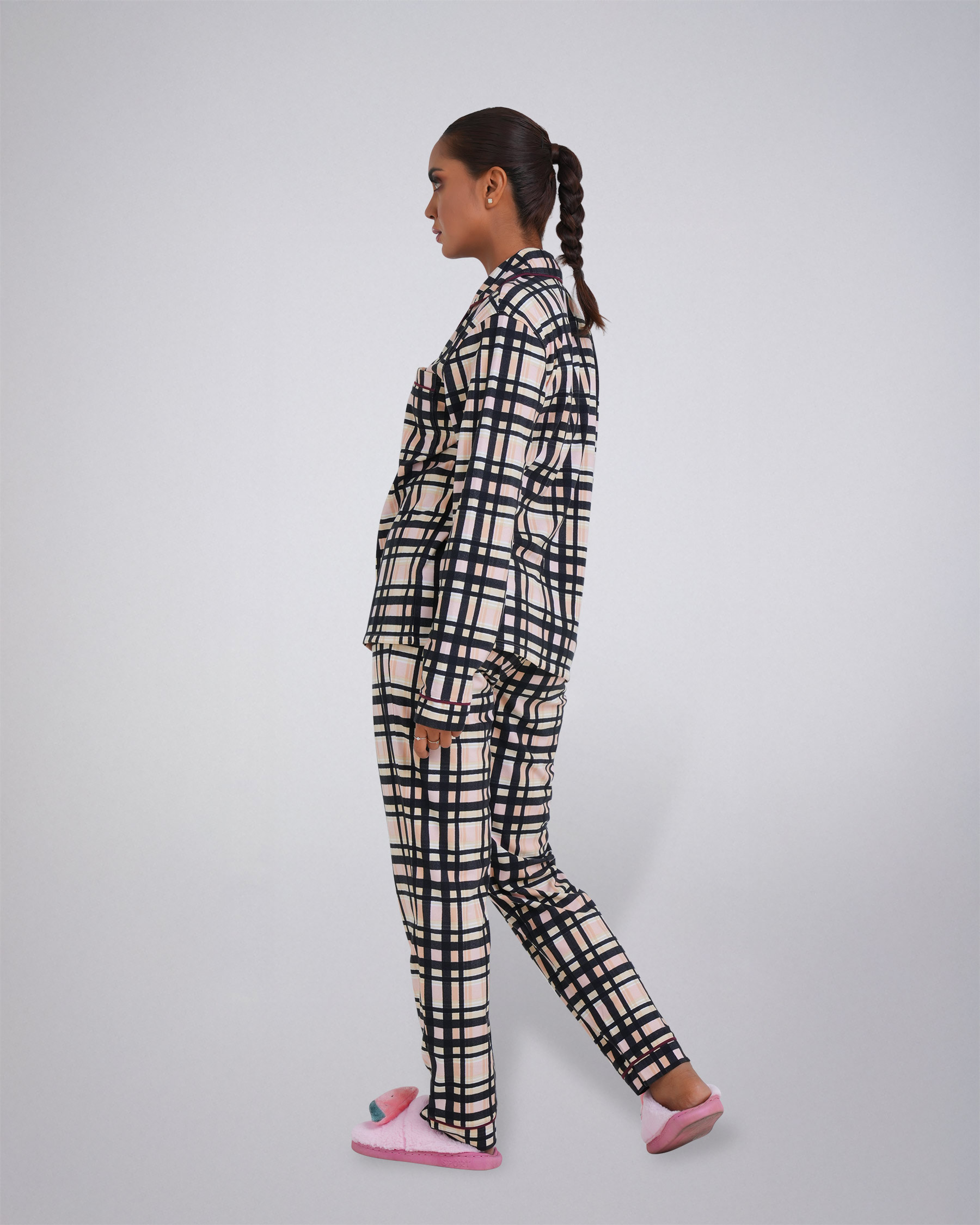 Leafletic Women's Check Print Sleepwear Set | Long-Sleeve Button-Down Shirt & Matching Trousers | Soft & Comfortable Nightwear | Loungewear Pajama Set | Two-Piece Night Suit