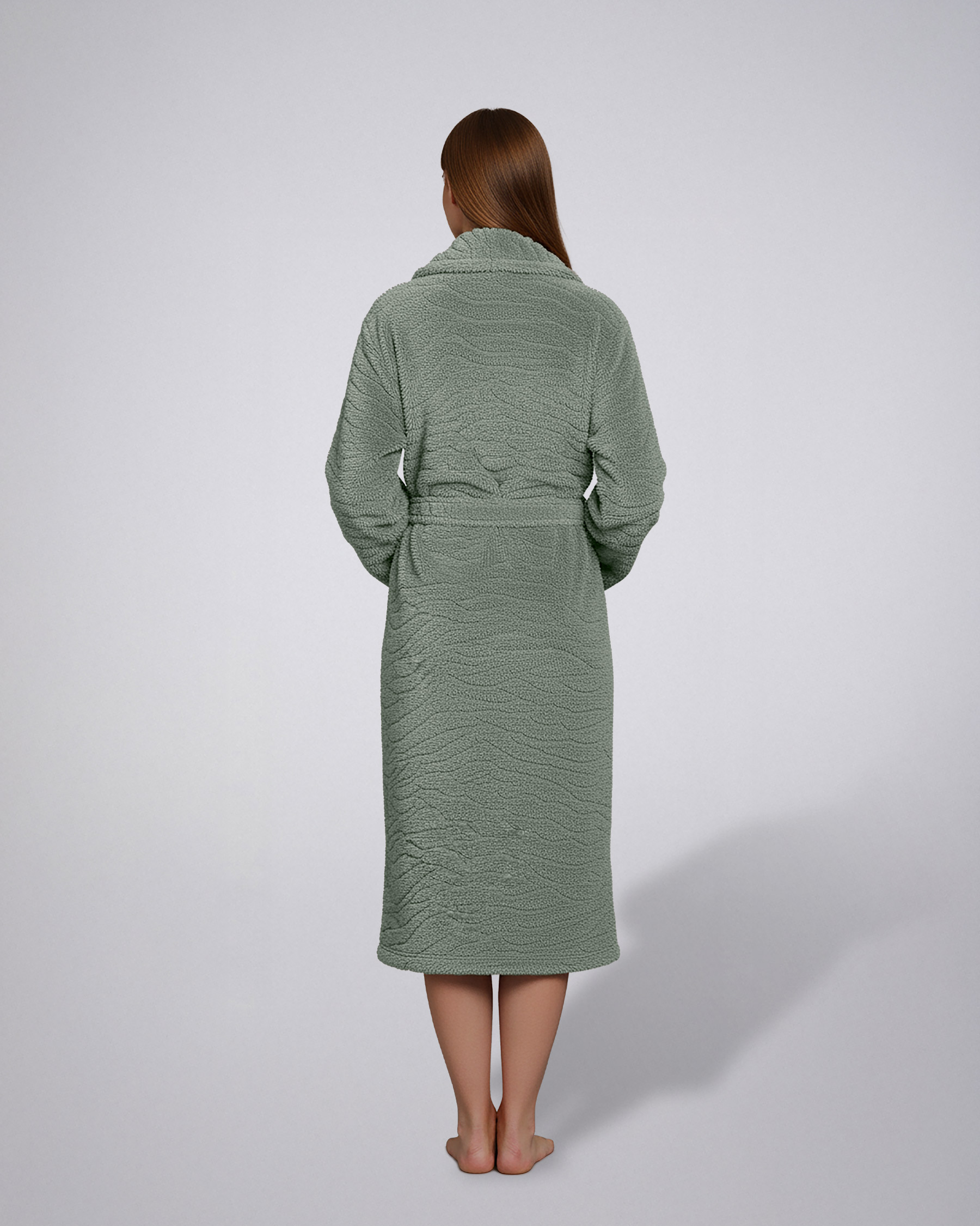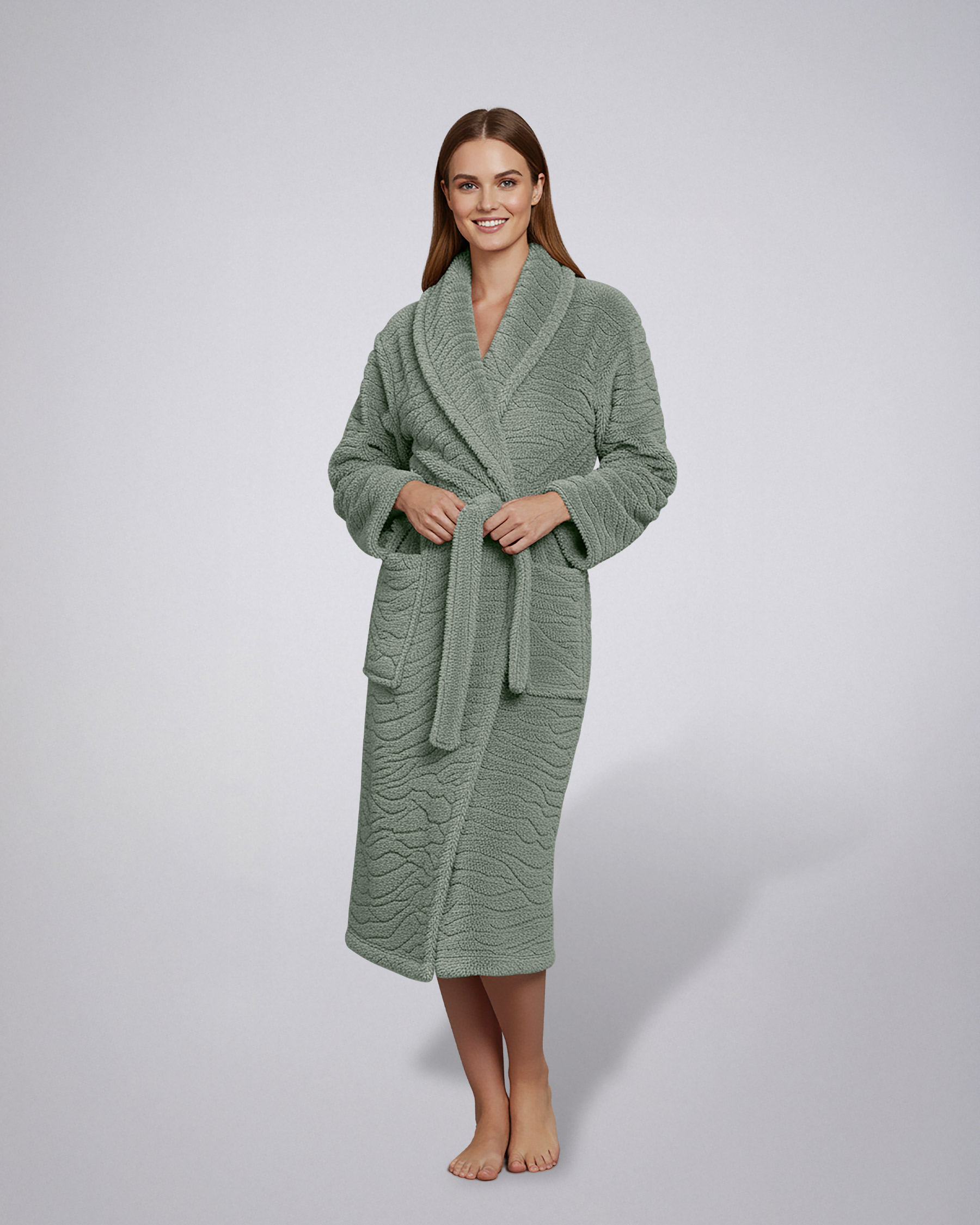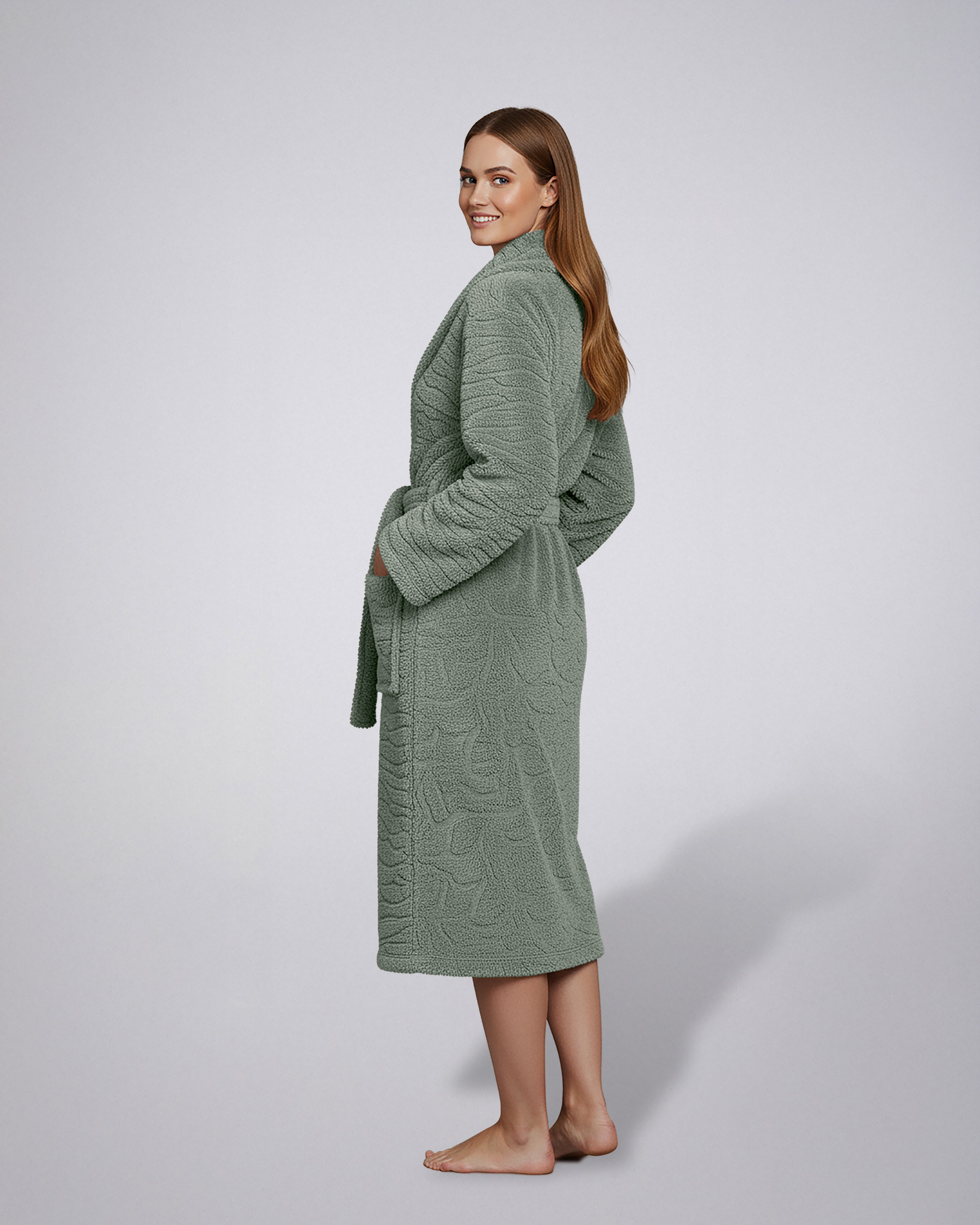 Indulge in unmatched comfort with the Leafletic Women’s Coral Fleece Lounge Robe. Designed for the ultimate relaxation experience, this luxurious bathrobe is your perfect companion for cozy mornings, relaxing evenings, or a spa-like feel after a shower. Crafted from premium 100% Polyester Coral Fleece Debossed fabric, this robe is exceptionally ultra-soft, durable, and retains warmth beautifully while remaining breathable and gentle on the skin. The unique debossed texture adds an elegant, stylish touch to your home wear. This long-length robe features a classic, cozy shawl collar that provides extra warmth around the neck and a secure, adjustable tie belt to cinch the waist for a flattering fit. Practicality is key, so we've included two large, deep side pockets, perfect for keeping your hands warm or storing your phone and small essentials. Whether you call it a bathrobe, a lounge robe or simply a cozy night dress, this piece promises maximum comfort and luxury. It's the perfect gift or a special treat for yourself.