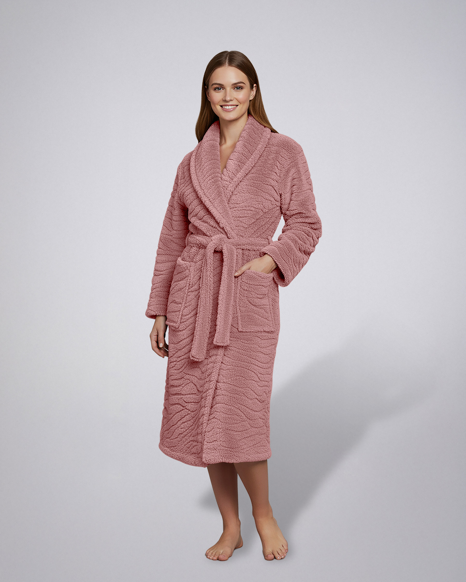 Indulge in unmatched comfort with the Leafletic Women’s Coral Fleece Lounge Robe. Designed for the ultimate relaxation experience, this luxurious bathrobe is your perfect companion for cozy mornings, relaxing evenings, or a spa-like feel after a shower. Crafted from premium 100% Polyester Coral Fleece Debossed fabric, this robe is exceptionally ultra-soft, durable, and retains warmth beautifully while remaining breathable and gentle on the skin. The unique debossed texture adds an elegant, stylish touch to your home wear. This long-length robe features a classic, cozy shawl collar that provides extra warmth around the neck and a secure, adjustable tie belt to cinch the waist for a flattering fit. Practicality is key, so we've included two large, deep side pockets, perfect for keeping your hands warm or storing your phone and small essentials. Whether you call it a bathrobe, a lounge robe or simply a cozy night dress, this piece promises maximum comfort and luxury. It's the perfect gift or a special treat for yourself.