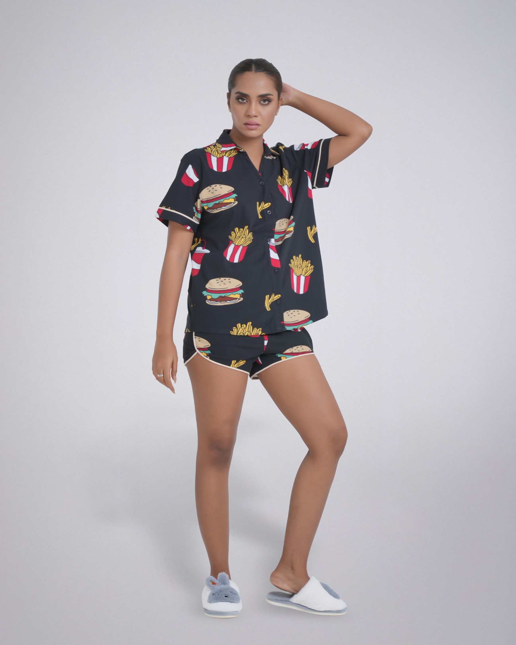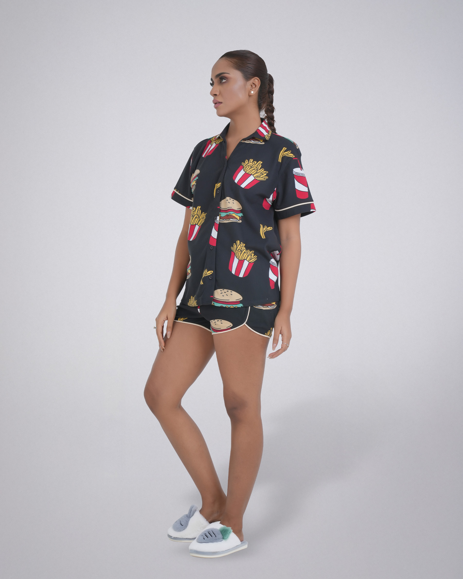 Leafletic Women's Short Sleepwear Set | Short-Sleeve Button-Down Shirt & Matching Shorts | All-Over Print Soft & Comfortable Nightwear | Short Pajama Loungewear | Two-Piece Night Suit