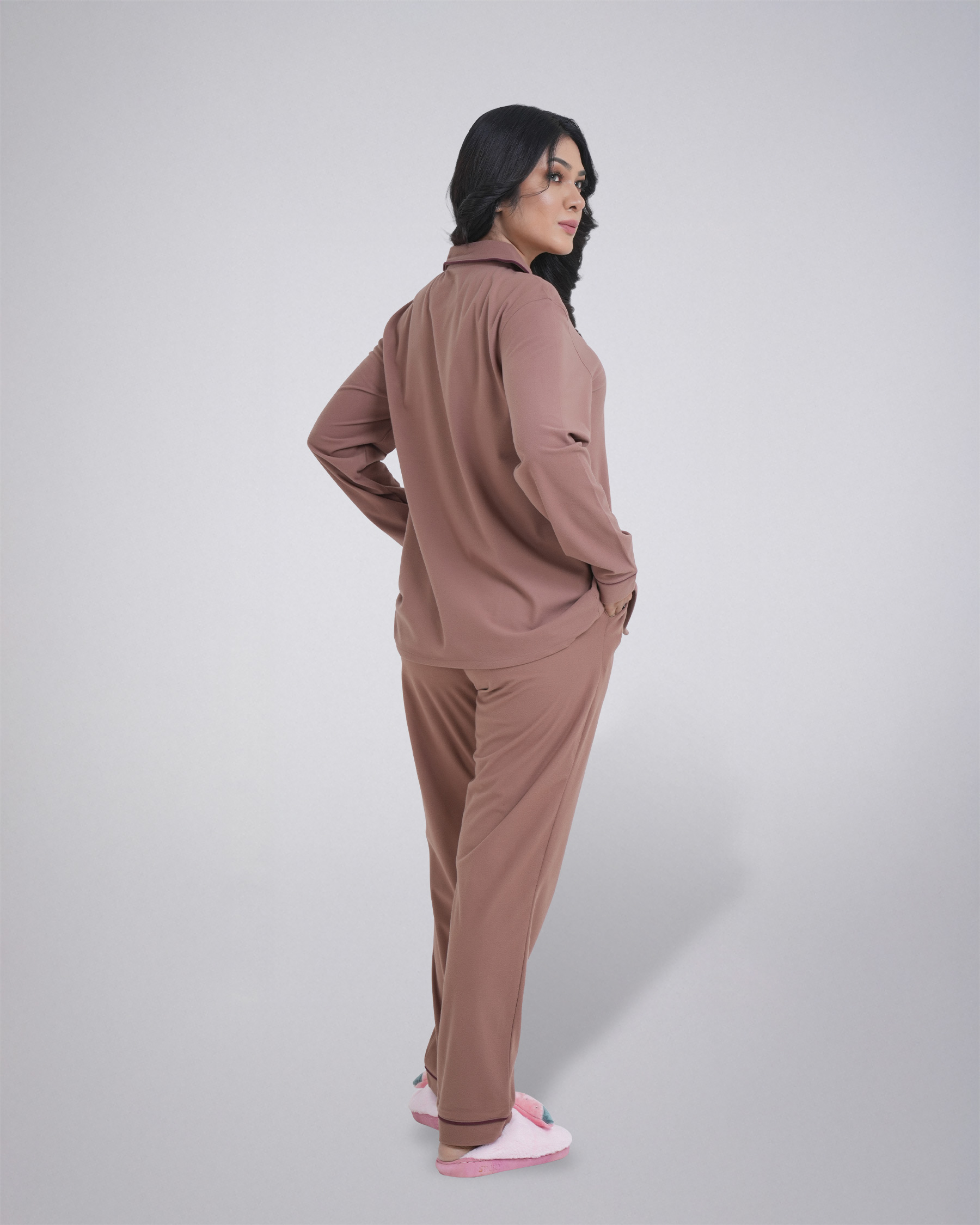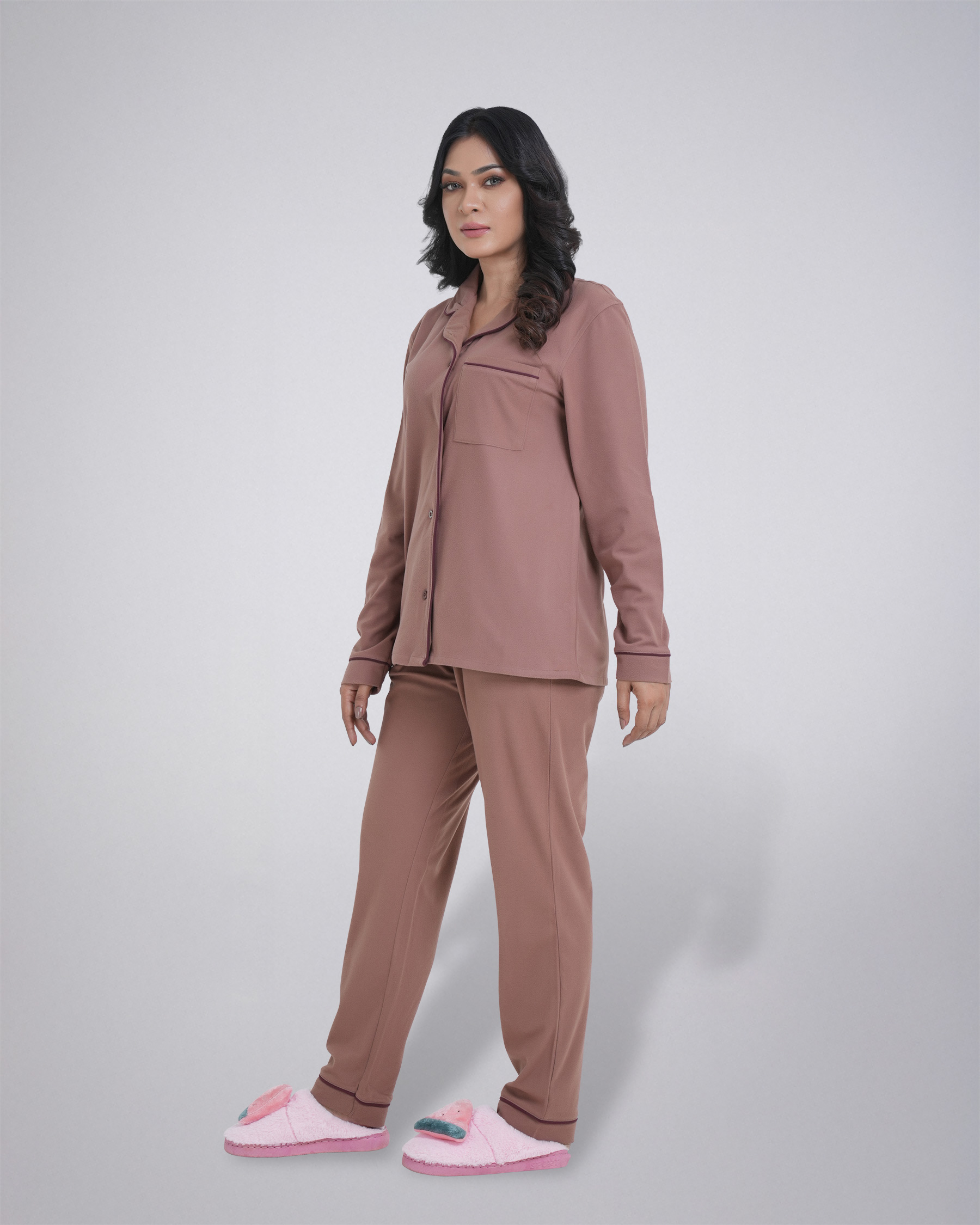 The set features a classic long-sleeve shirt with a stylish collar and button-down front, complete with a convenient chest pocket. The matching trouser comes with an elastic waistband and an adjustable drawstring, providing a perfect and secure fit. The contrast piping detail adds a touch of elegance to this simple yet chic design. Whether you're unwinding after a long day or enjoying a lazy weekend morning, this pajama set is your go-to choice. Its durable material ensures long-lasting wear, while the easy-care fabric makes it a practical addition to your wardrobe.