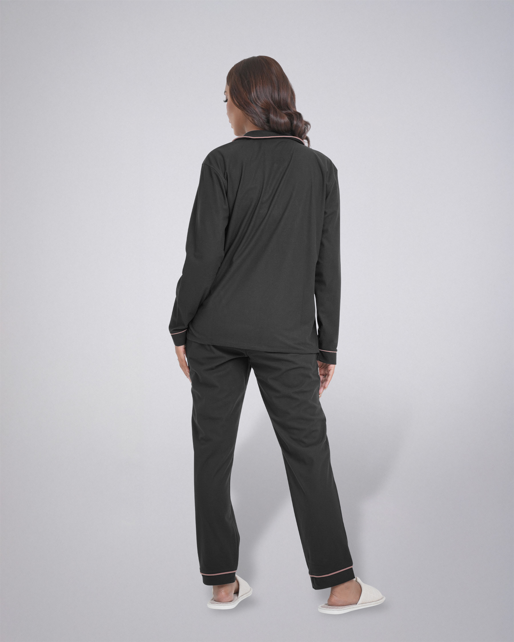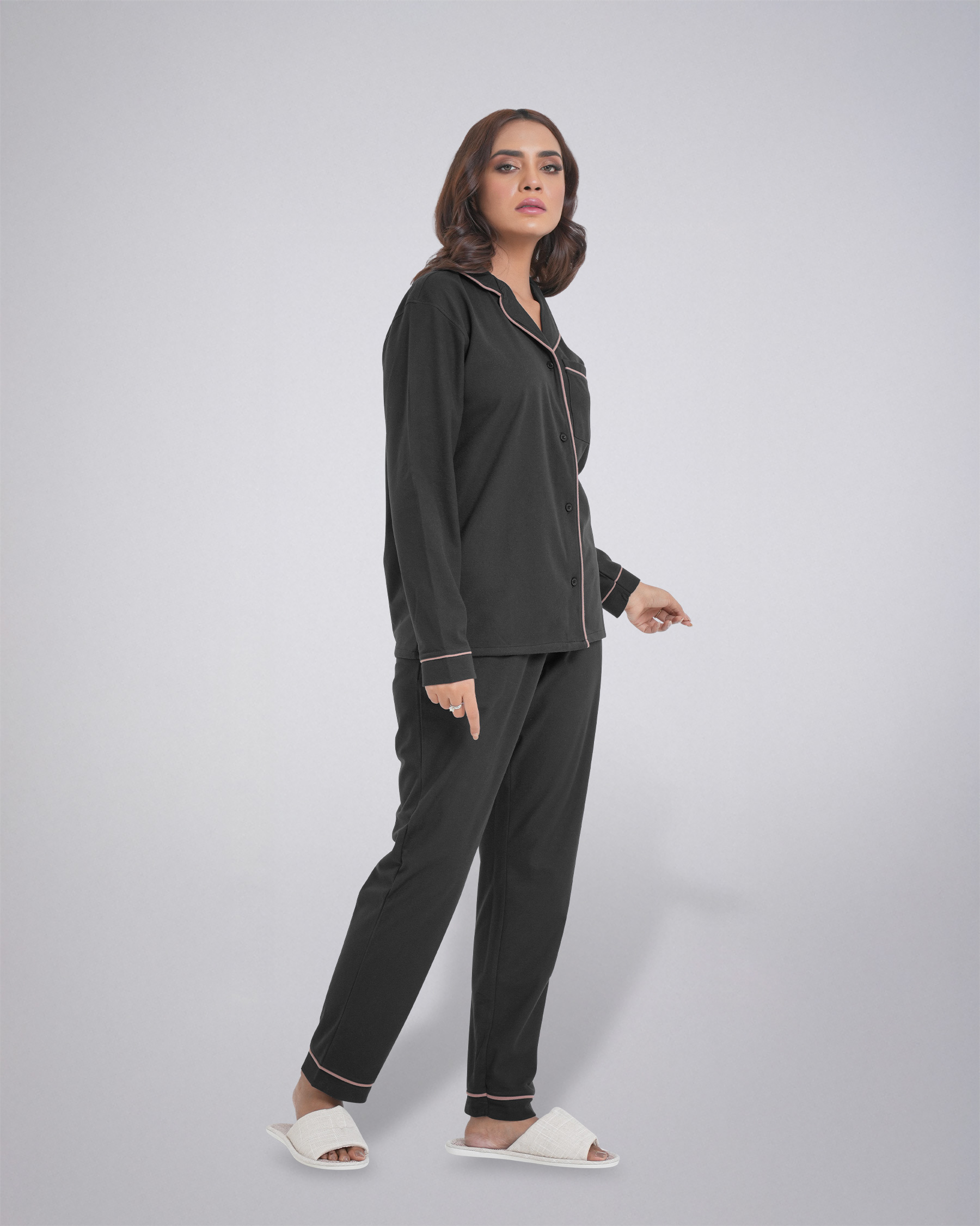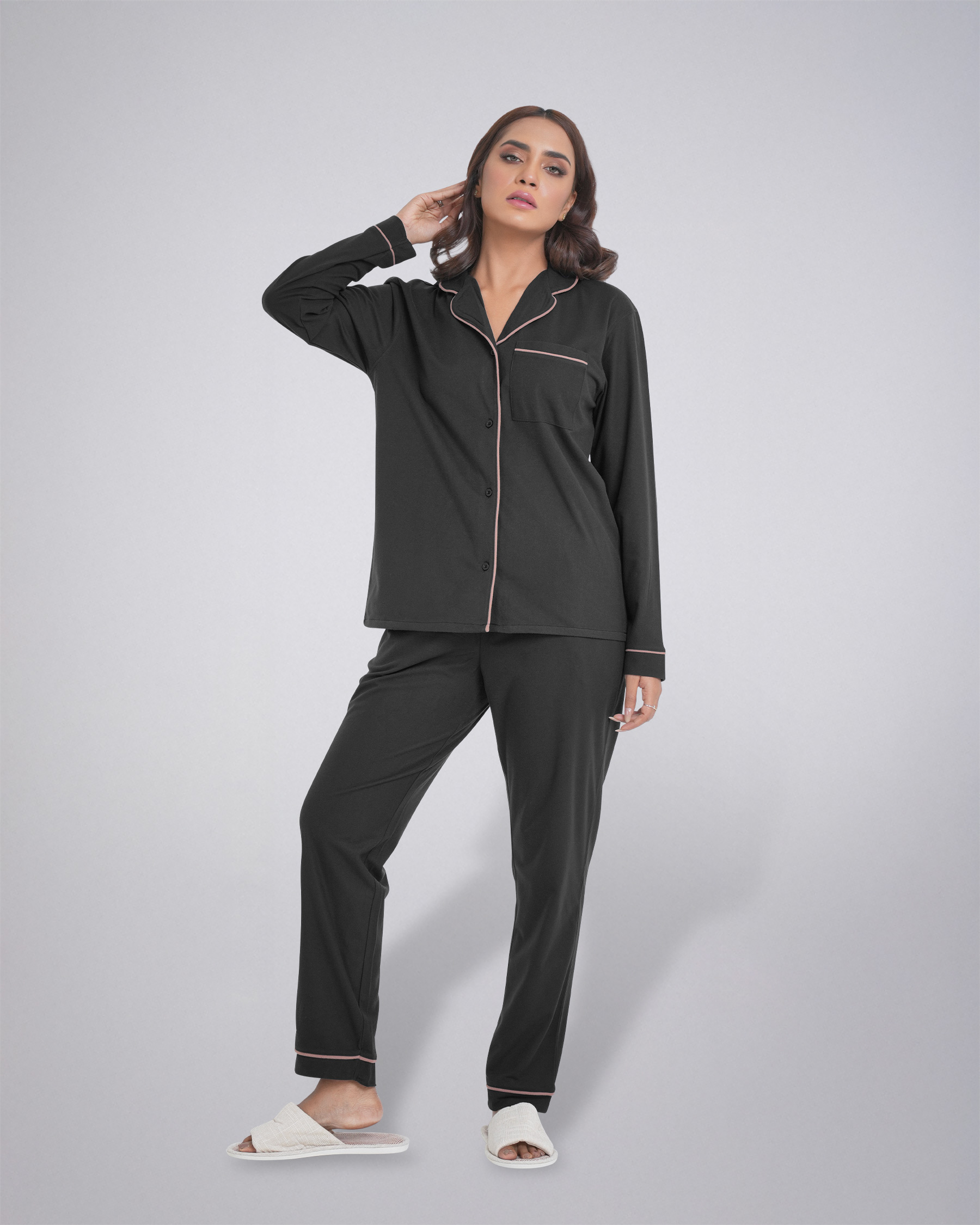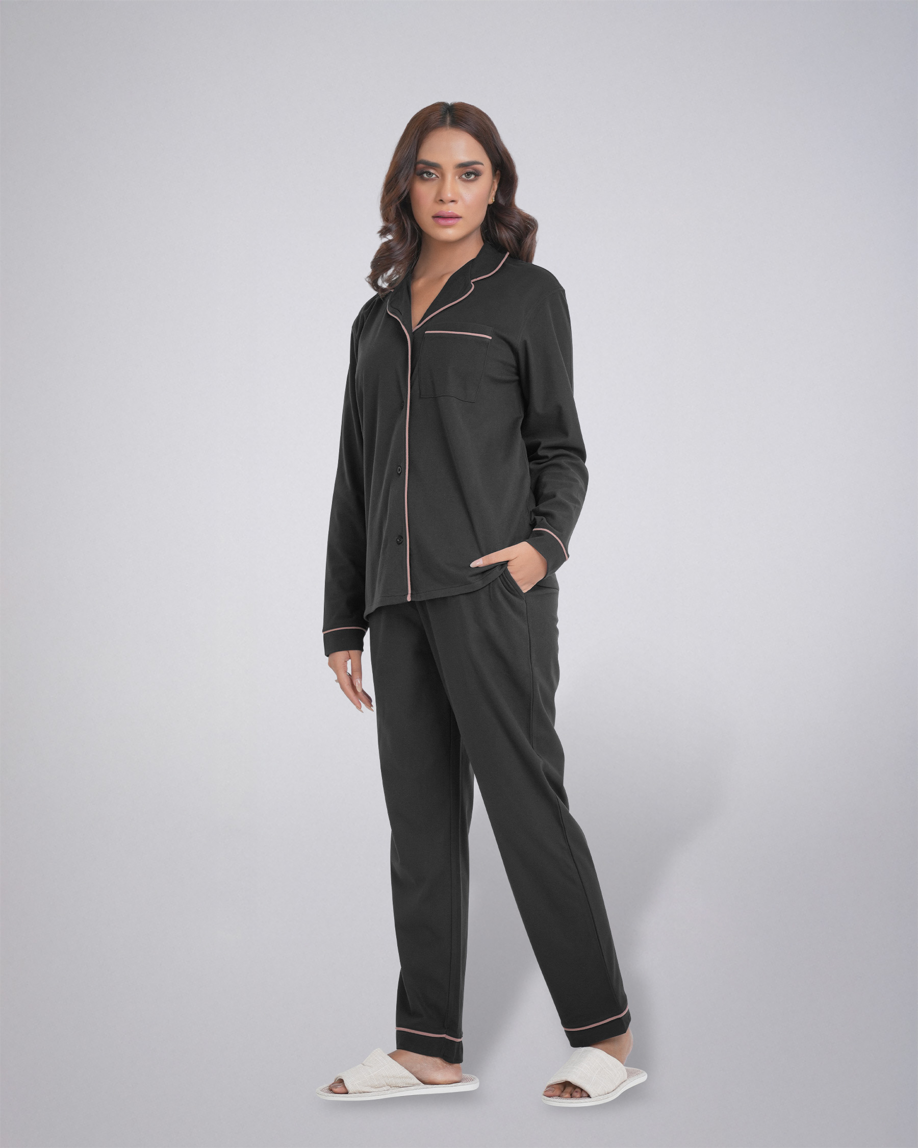 The set features a classic long-sleeve shirt with a stylish collar and button-down front, complete with a convenient chest pocket. The matching trouser comes with an elastic waistband and an adjustable drawstring, providing a perfect and secure fit. The contrast piping detail adds a touch of elegance to this simple yet chic design. Whether you're unwinding after a long day or enjoying a lazy weekend morning, this pajama set is your go-to choice. Its durable material ensures long-lasting wear, while the easy-care fabric makes it a practical addition to your wardrobe.
