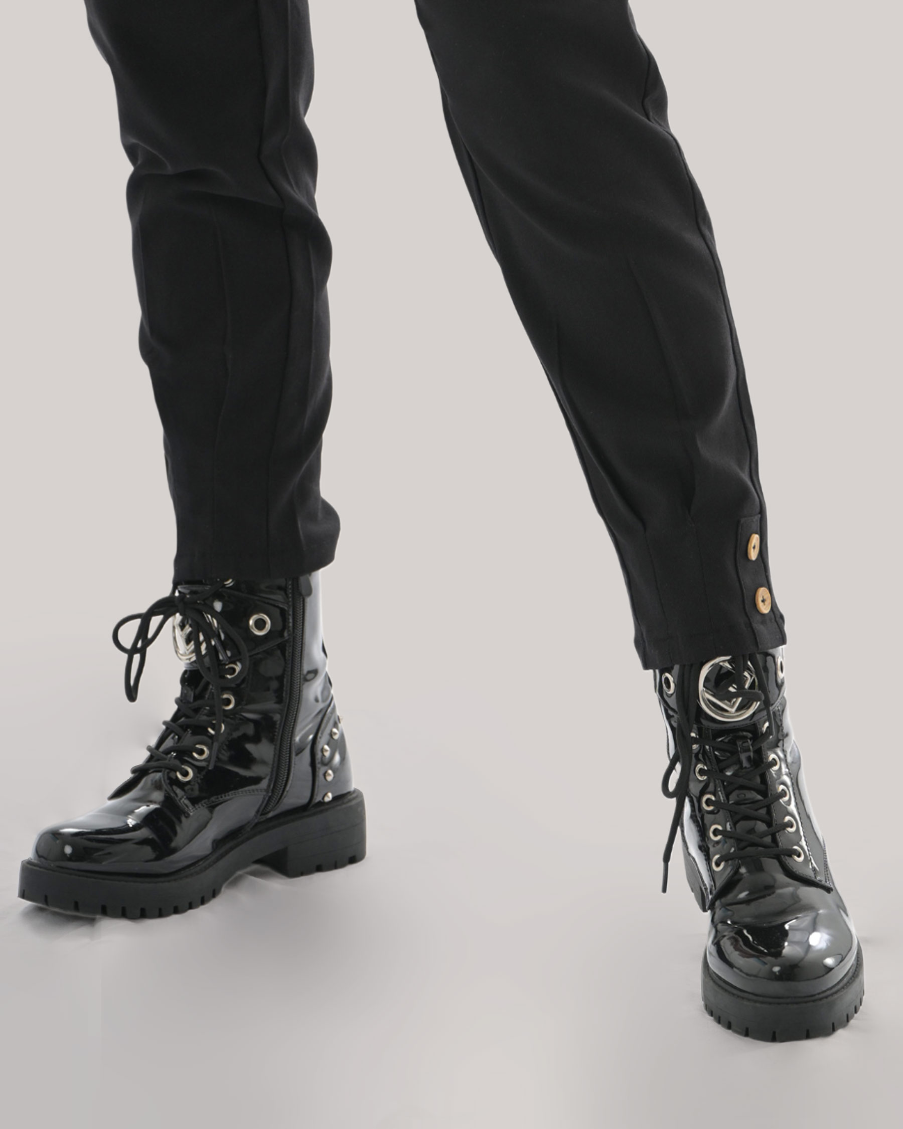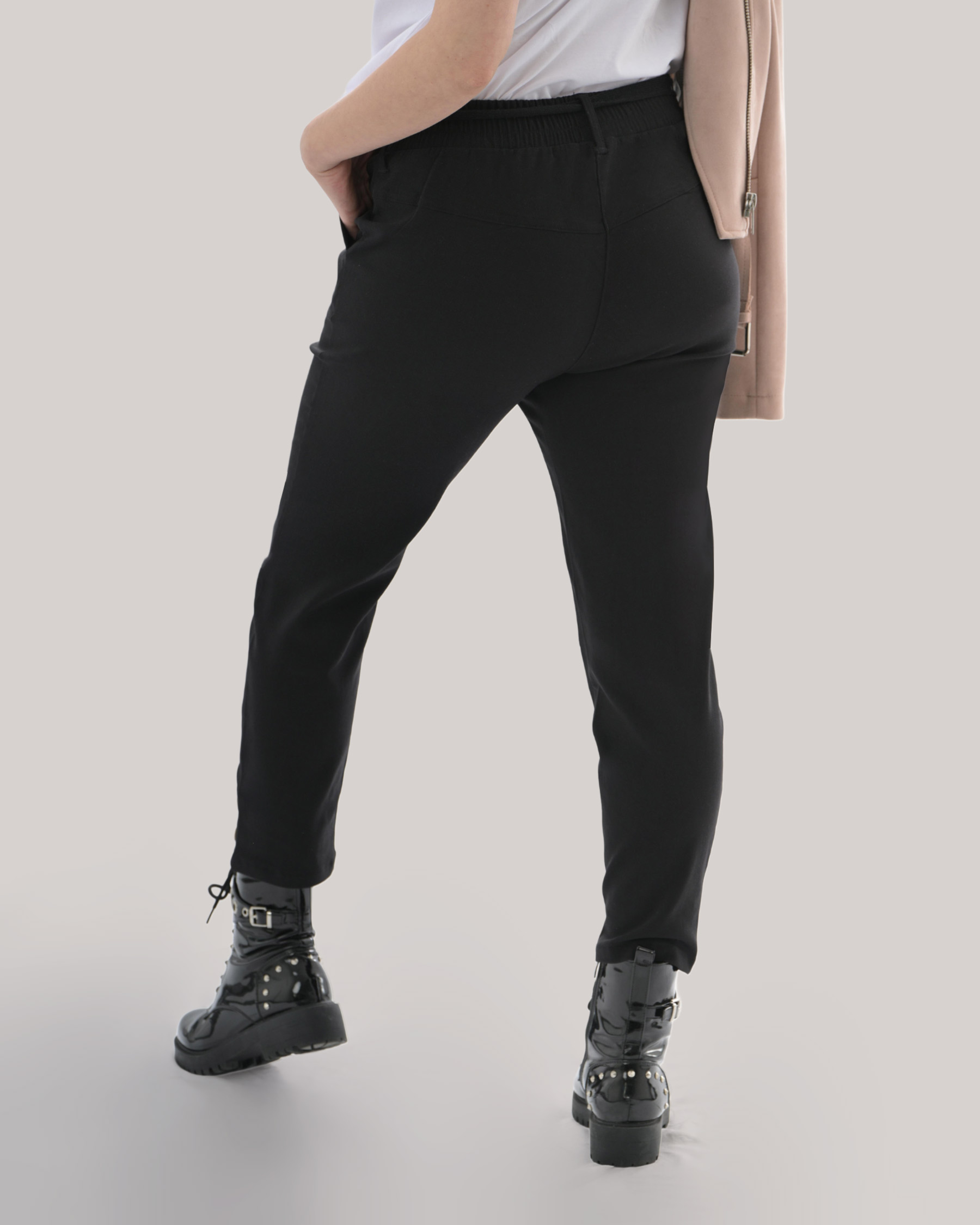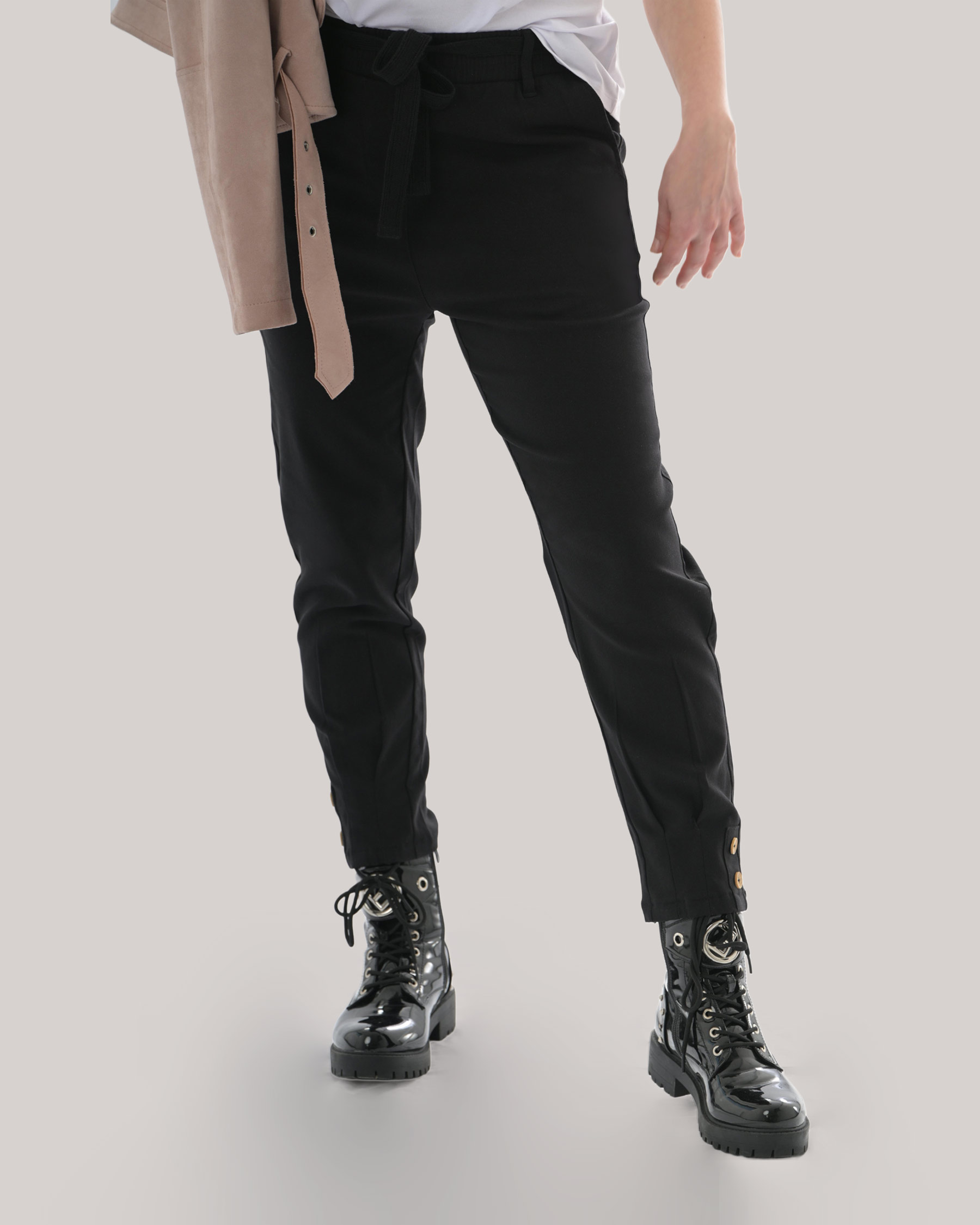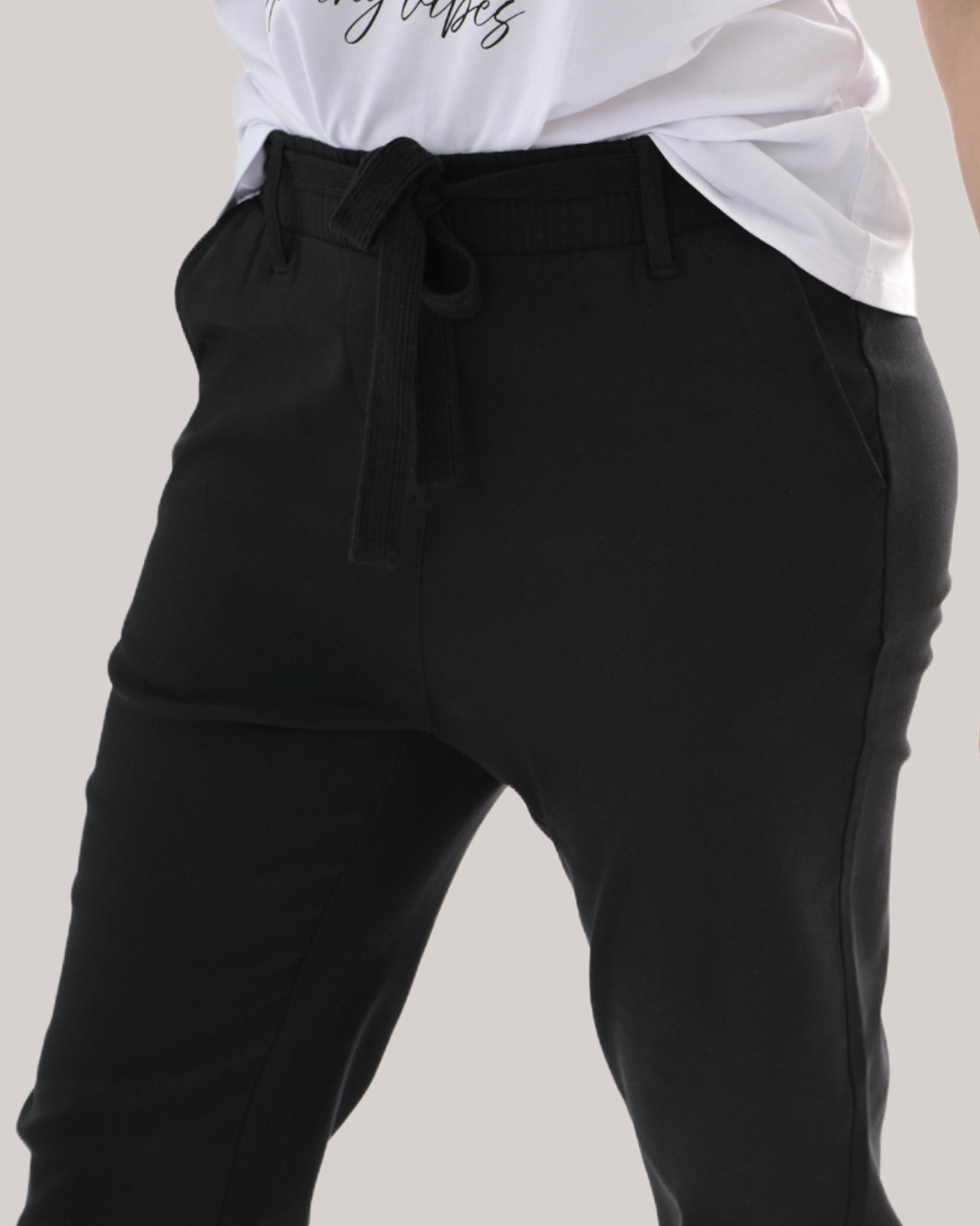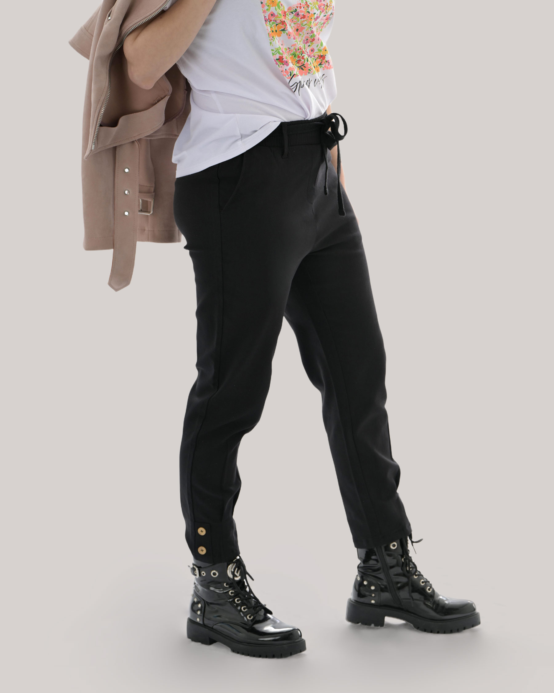 The trousers are designed with a mid-rise waist and a stylish drawstring for a customizable and comfortable fit. They also come with practical side pockets, perfect for carrying your phone, keys, or other essentials. The tapered leg and subtle button details at the hem add a touch of modern flair, allowing you to wear them with anything from sneakers to casual boots. Whether you're running errands or enjoying a day out with friends, these women's pants offer a perfect balance of comfort, style, and functionality.