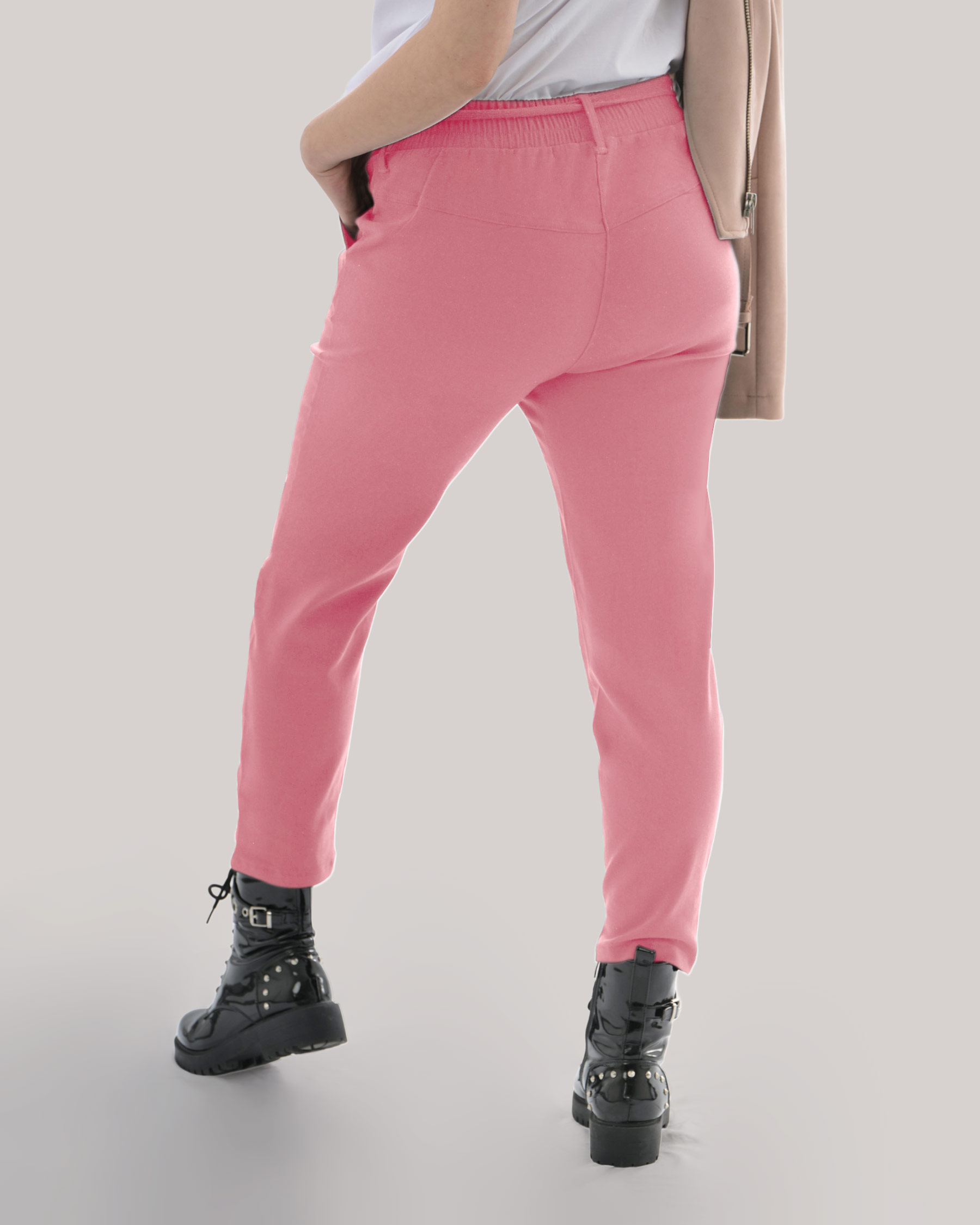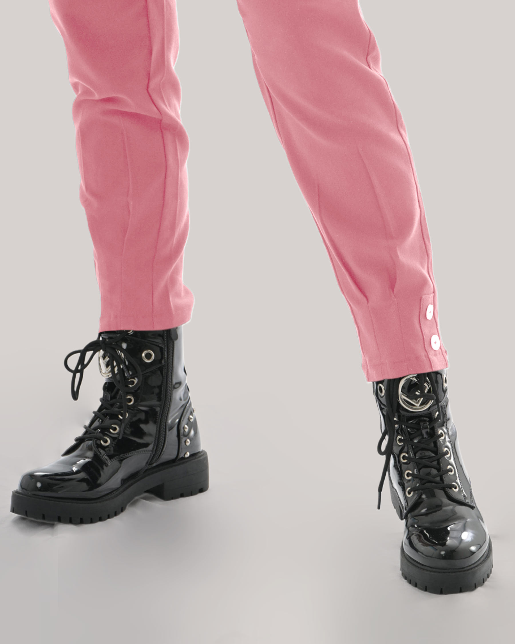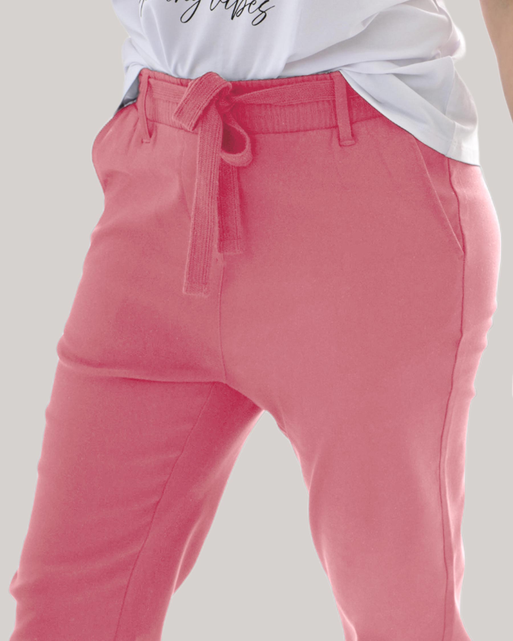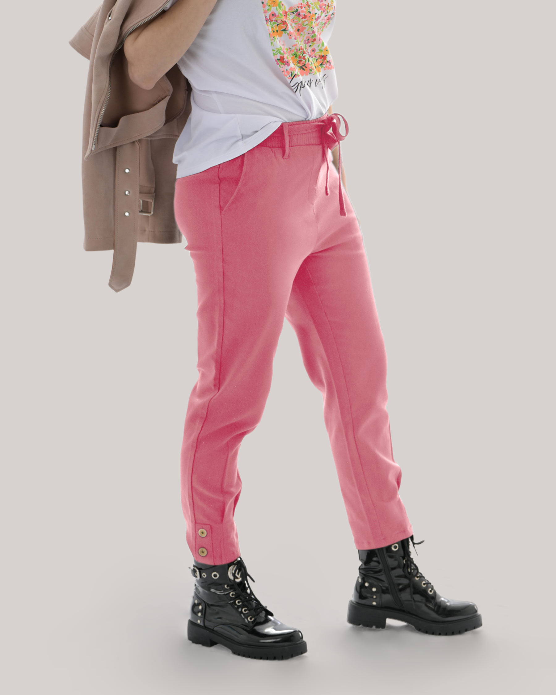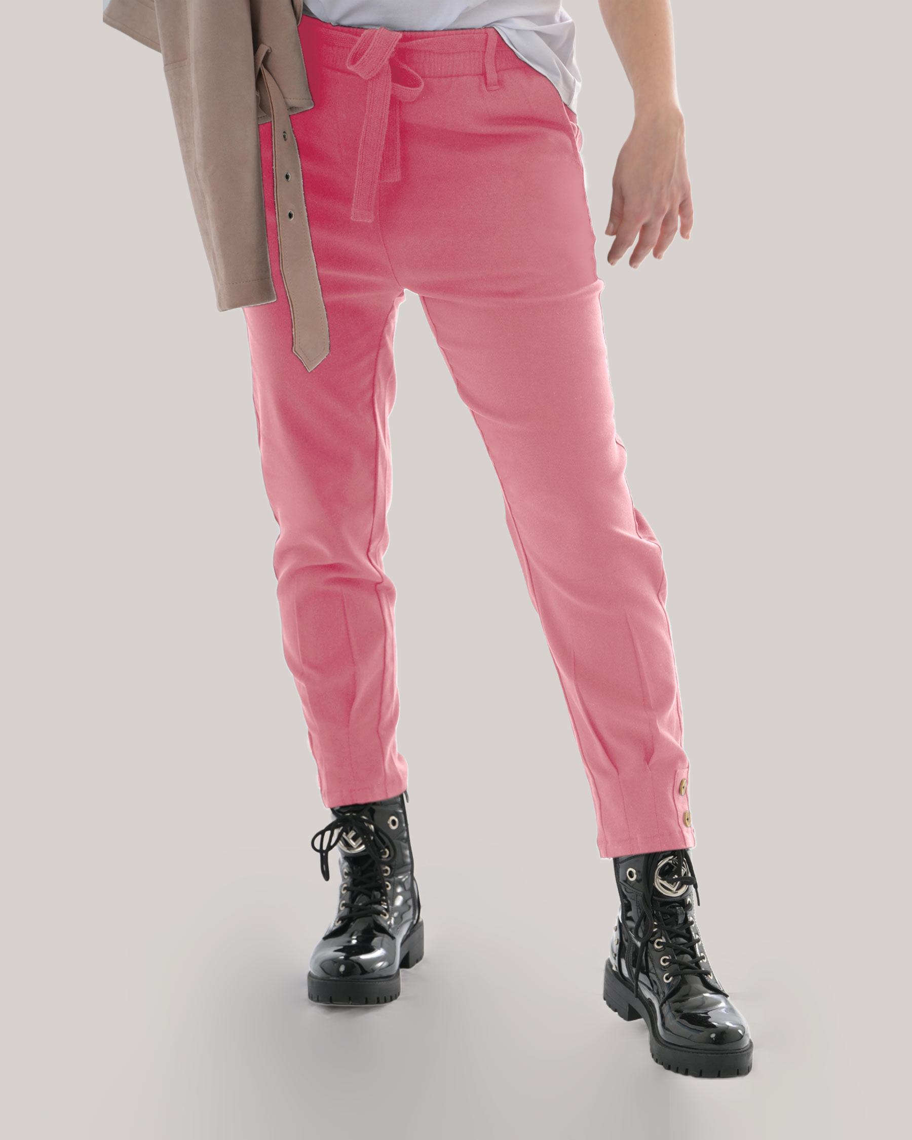 The trousers are designed with a mid-rise waist and a stylish drawstring for a customizable and comfortable fit. They also come with practical side pockets, perfect for carrying your phone, keys, or other essentials. The tapered leg and subtle button details at the hem add a touch of modern flair, allowing you to wear them with anything from sneakers to casual boots. Whether you're running errands or enjoying a day out with friends, these women's pants offer a perfect balance of comfort, style, and functionality.