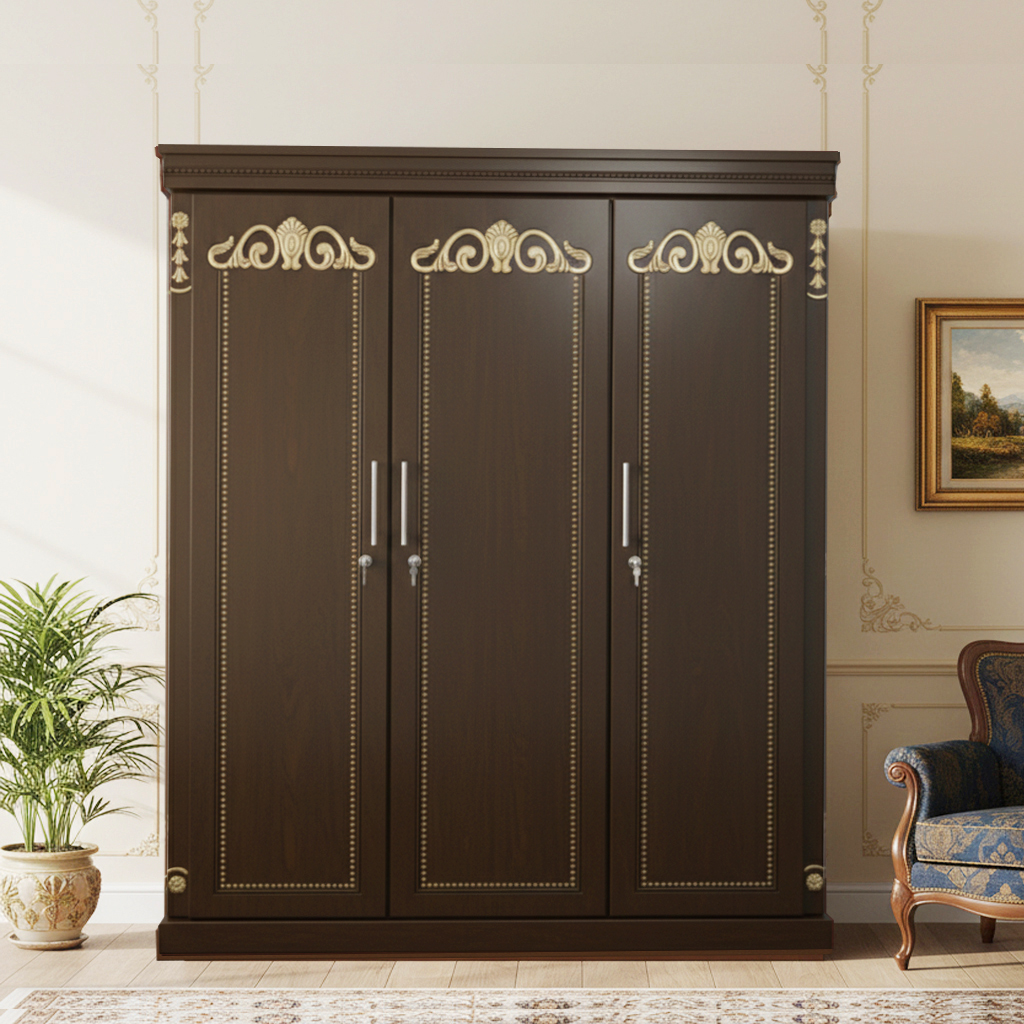 Letaya Gold Deco Paint Lacquer Polish 3 Door Almirah, Rich Home Wardrobe for Bedroom, Multiple Shelves to Organise your Clothes, Hanging Rod, Lockable Door & Drawer Almirah 72/48