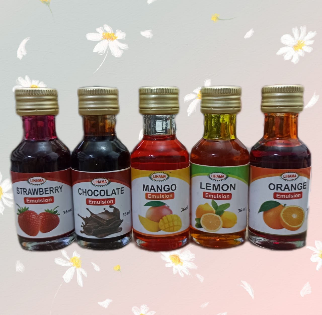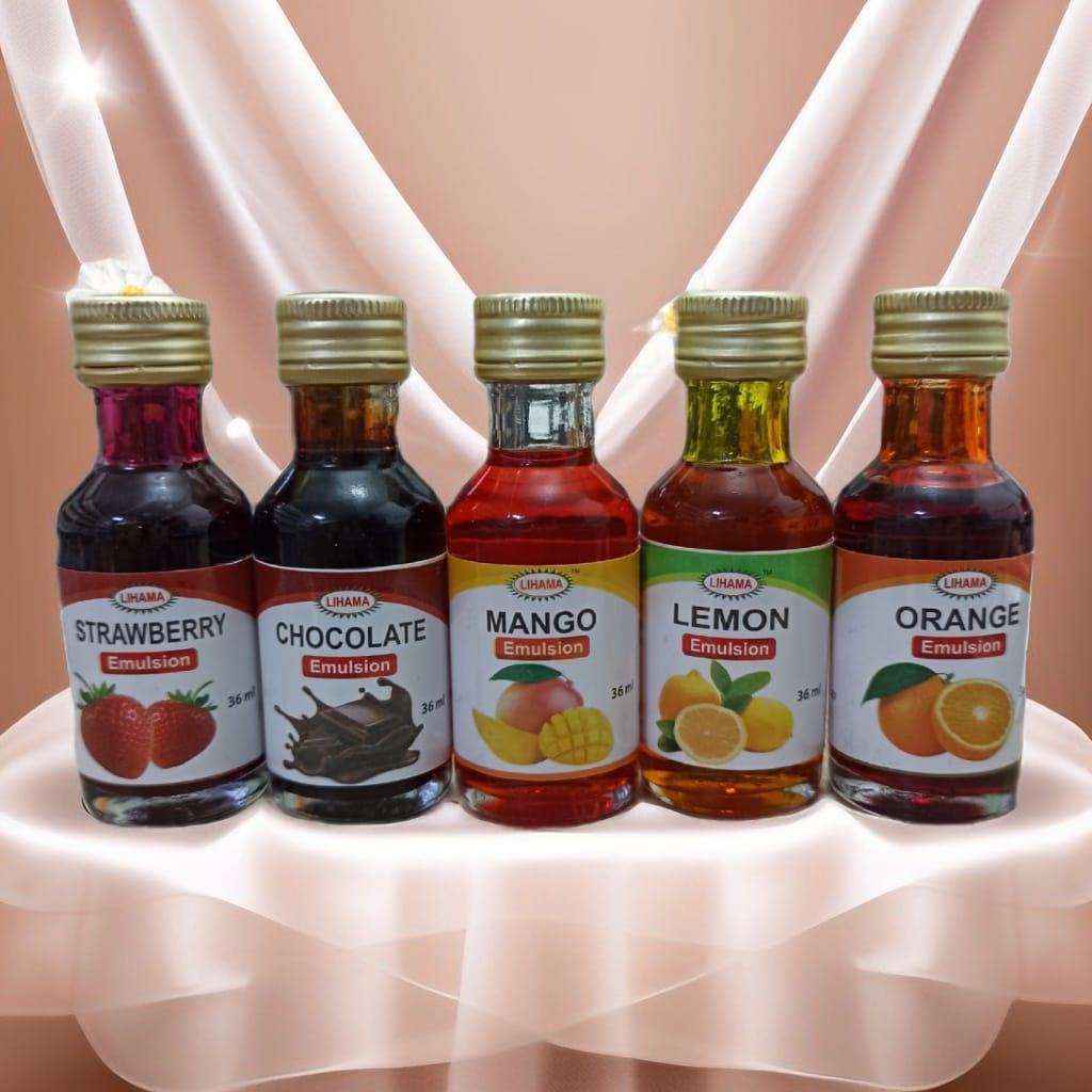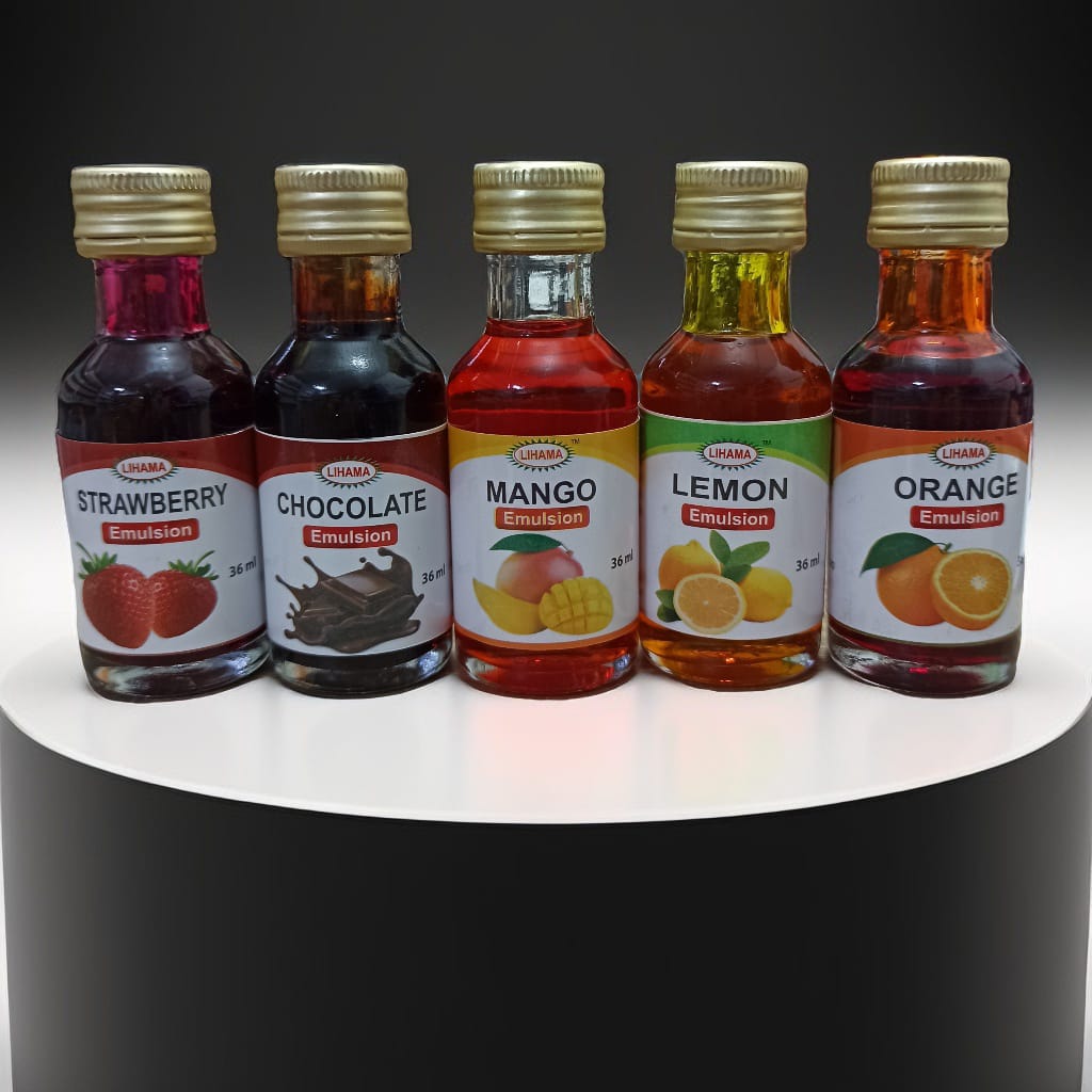 These are a combo set of water-based baking emulsions that combine both flavoring and coloring in one product for baked goods and other dishes. The set includes flavors like strawberry, chocolate, mango, orange, and lemon, which are more potent than traditional extracts and are heat-stable, meaning the flavor won't bake out. They are ready-made mixes that add a concentrated burst of flavor and color, suitable for a wide range of applications.