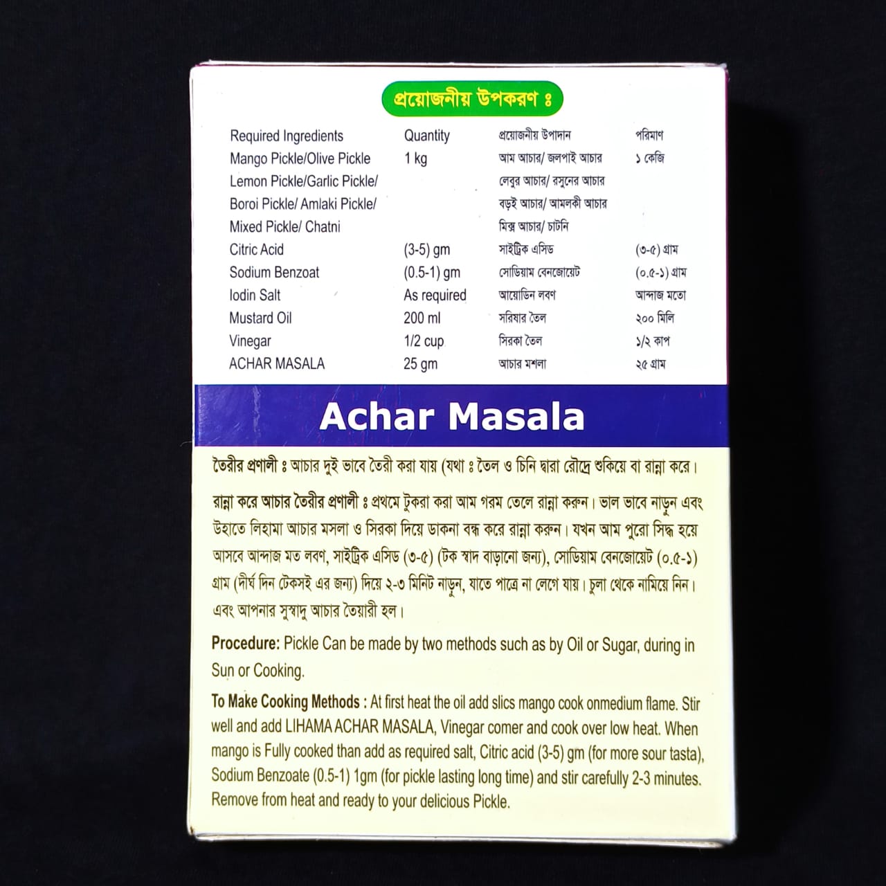 আচার মশলা হলো বিভিন্ন মশলার একটি মিশ্রণ, যা মূলত ভারতীয় ধাঁচের আচার তৈরি করতে ব্যবহৃত হয় এবং এটি খাবারে আচার-জাতীয় টক, মশলাদার ও তেতো স্বাদ যোগ করে। এই মশলার মিশ্রণ সাধারণত হলুদ, সরিষা, কালোজিরা, মৌরি, শুকনো মরিচ, পাঁচফোড়ন, রসুন, এবং কখনো কখনো কাশ্মীরি মরিচ ব্যবহার করে তৈরি হয়, যা একটি স্বতন্ত্র ও সুগন্ধি মিশ্রণ তৈরি করে।