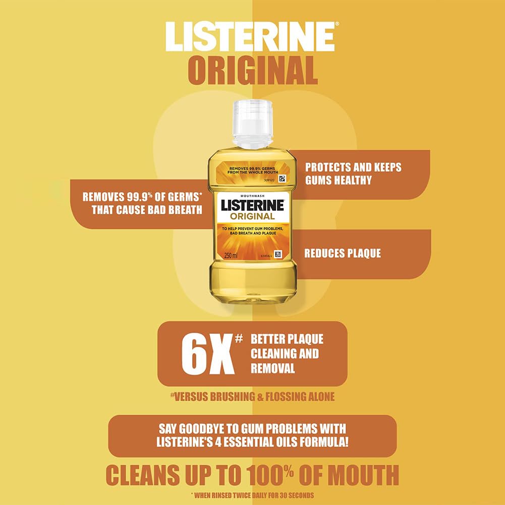 Listerine Original Mouthwash 250 ml is a powerful antiseptic mouthwash designed to kill up to 99.9% of germs that cause bad breath, plaque, and gum problems. Its clinically proven formula reaches areas that brushing alone may miss, providing complete oral care protection.
