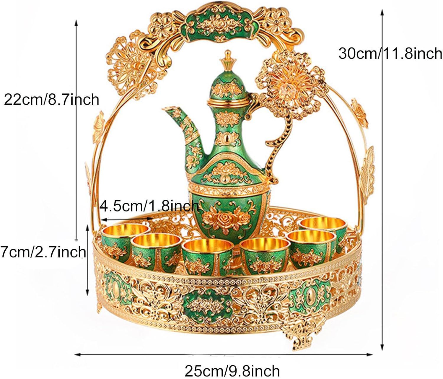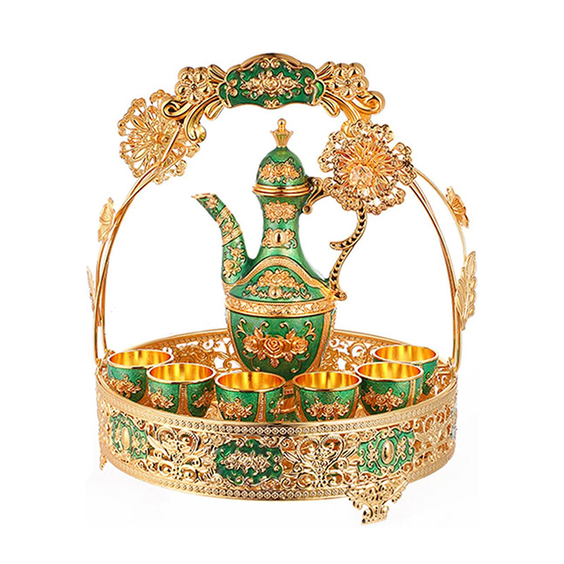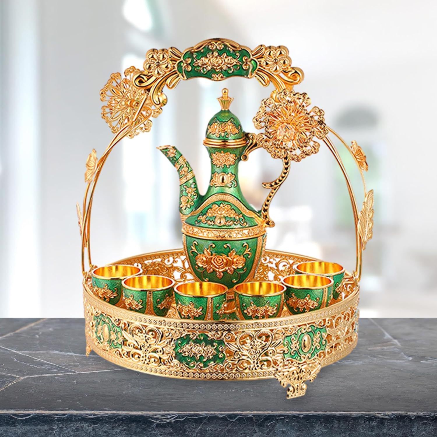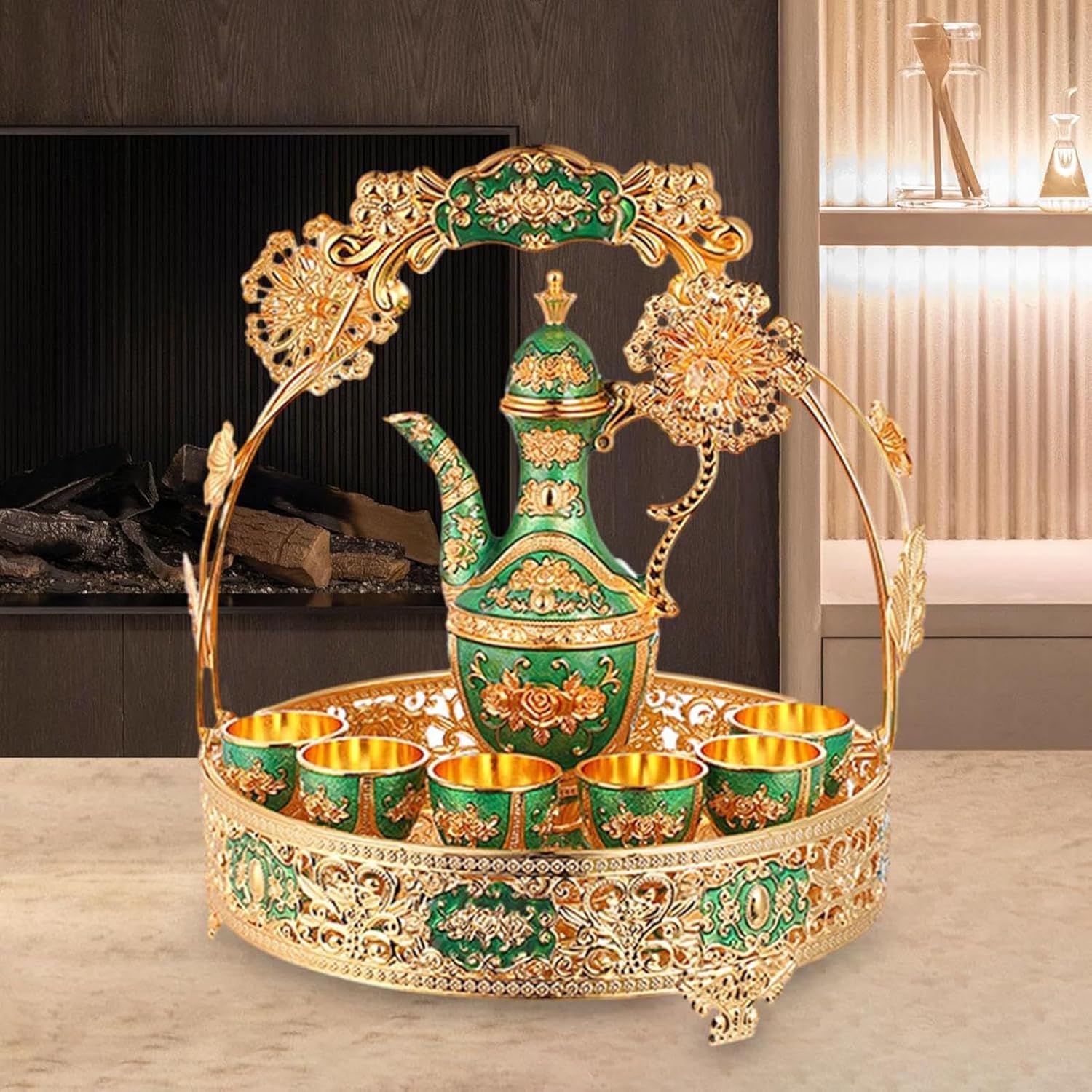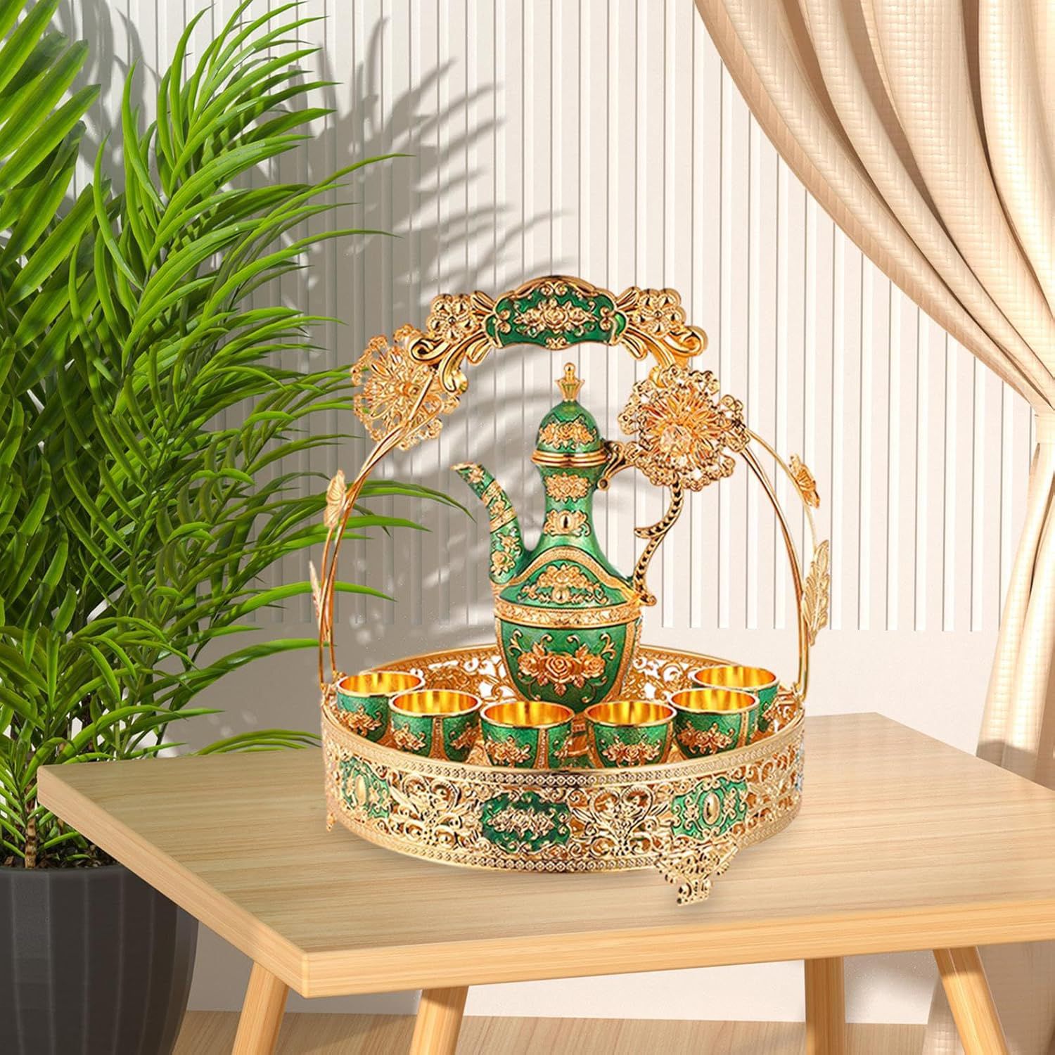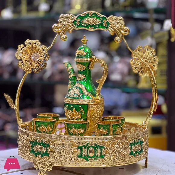 Elevate your home decor with this Luxury Arabic Style Tea Set Showpiece. Crafted with intricate floral patterns in stunning green and gold, this 7-piece decorative set includes a teapot, 6 cups, and a beautifully designed tray — perfect as a royal gift or elegant display item.