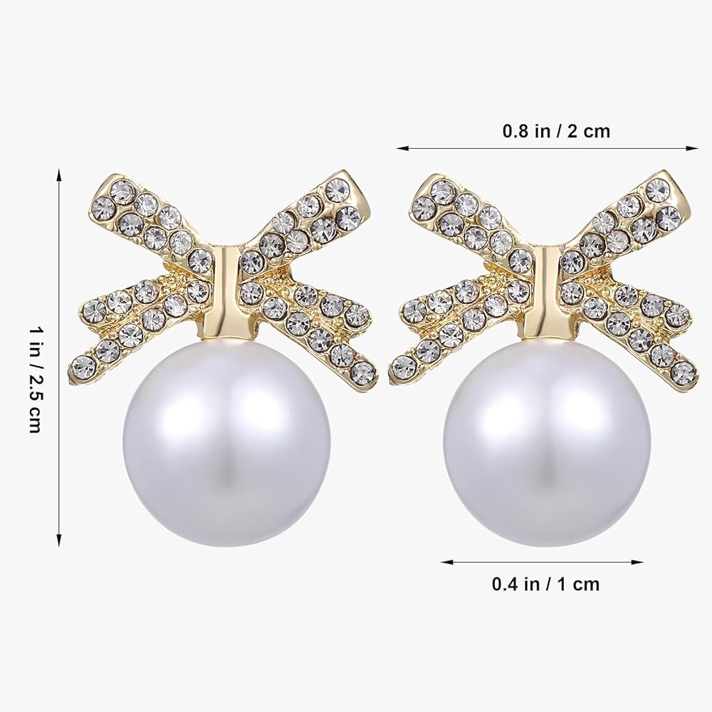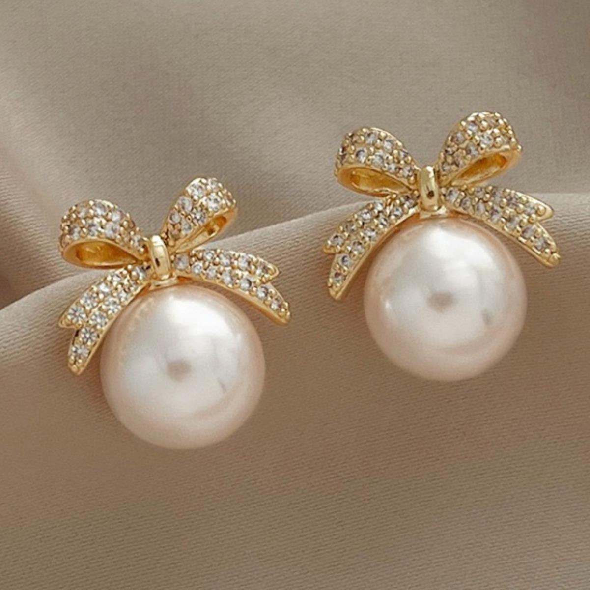 Luxury Rhinestone Bowknot Pearl Drop Earrings - Gold Plated