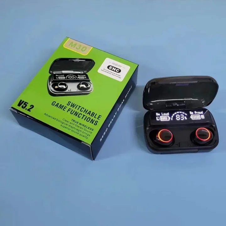 - Product Model: M30Manipulation Mode: Touch controlItem : Wireless Stereo EarphoneVersion : V5.2Waterproof IPX7Wireless Profiles : Support HFP 1.7, HSP 1.2, A2DP 1, AVRCP 1.6, SPP 1.2 and PBAP 1.0Effective Distance : 10-15MFrequency Range : 100Hz-10KHzCase Battery Capacity : 50mAhEarbud Battery Capacity : 800mAhStandby Time : 150 HoursTalkin Time : 4 Hours (Full Charge)Music : 4 Hours (Full Charge)Charging Time : 1-2 HoursShutdown Current : 3-5UACompatible : Ponsel/Notebook/Perangkat Bluetooth