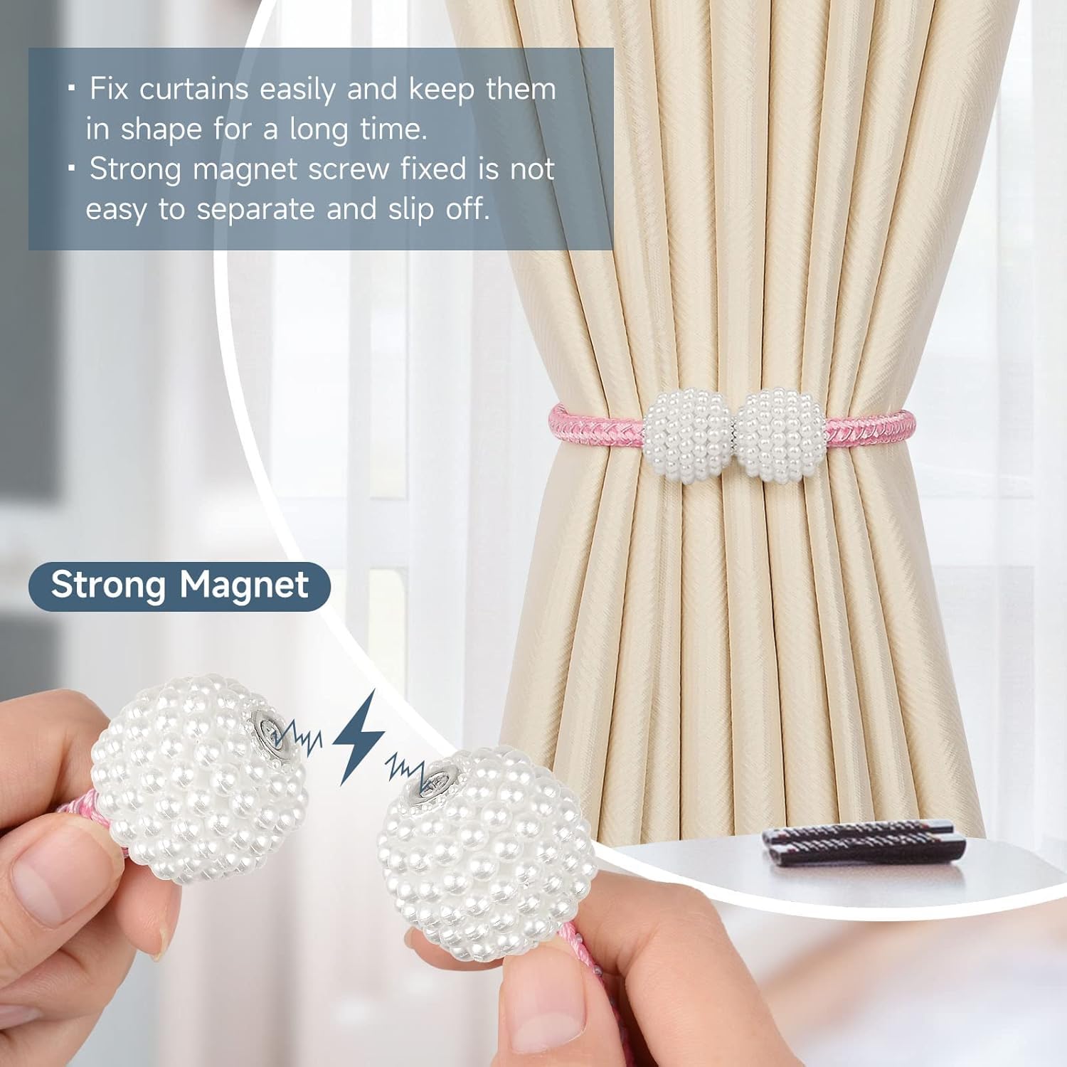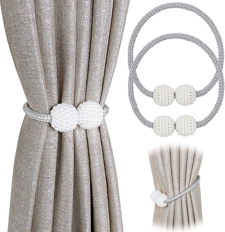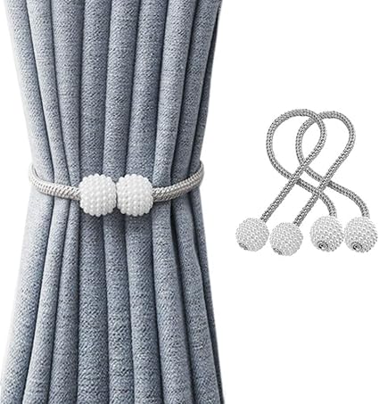 - 【Unique Design】 Perfect option to hold back your drapes without damage to the wall.Crafted from high quality plastic with beaded ball and knit design, the magnetic backs of the curtains brighten up your curtains and add elegance to your space. The soft knitting rope can be circled to attach curtains of varying thickness. The magnetic ties are very handy to hold thick curtains. For the thin curtains you can wrap it around twice or simply tie it!