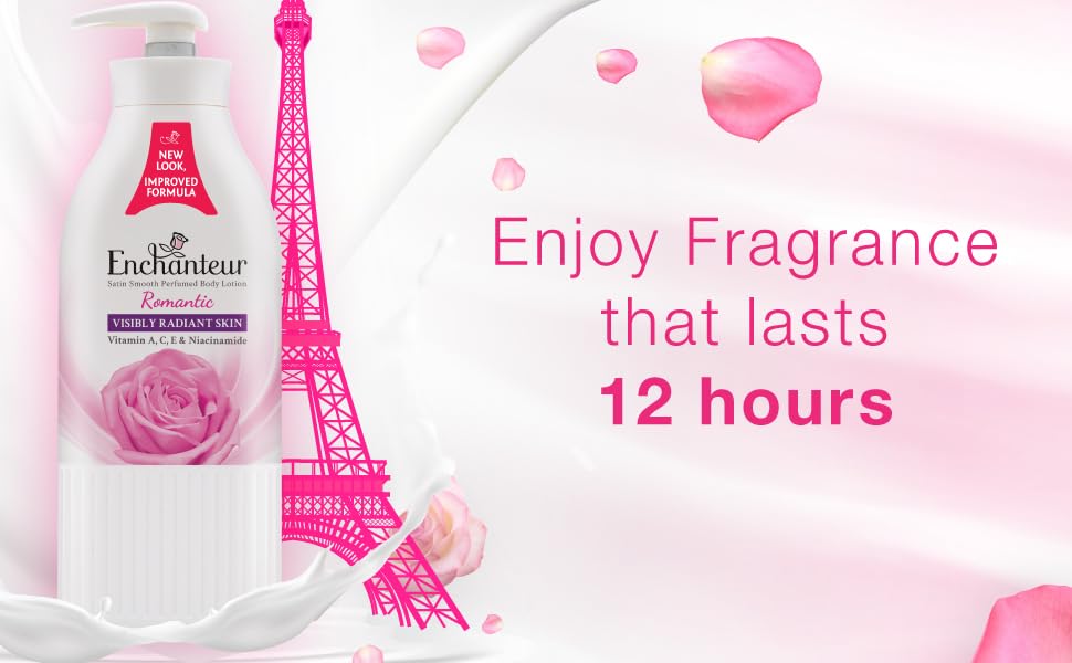 Sweet romance lingers in the air for every woman who chooses Enchanteur Romantic Satin Smooth Body Lotion for all seasons. Its floral fragrance is an enchanting blend of roses, violets & jasmine intertwined with sweet vanilla notes. Immerse yourself in its romantic and alluring scent as it wraps you in a sensory embrace. This summer hydrating lotion, with the benefits of niacinamide, goes beyond mere hydration as it lavishes your skin with tender care.