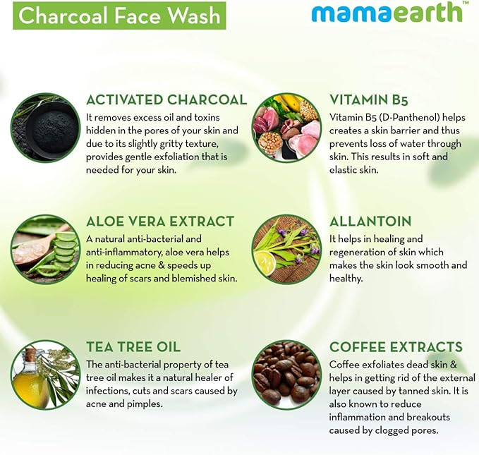Mamaearth’s SLS & Paraben free Charcoal Face Wash is your solution for healthy and glowing skin. Activated Charcoal gently draws out dirt, impurities, microparticles, & makeup – leaving skin clean and fresh. Clay deeply penetrates within the pores while removing excess oil from the skin. All this, without irritating or over-drying the skin. Coffee vitalizes the skin by removing dead skin cells and gives the face a glow. Dermatologically tested and pH balanced, this face wash takes gentle care of your skin. It leaves your skin feeling soft and smooth as it does not contain any harmful chemicals like SLS, Sulfates, Phthalates or, Artificial Fragrance.