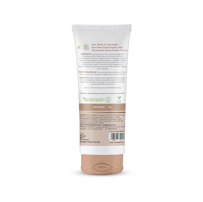 Mamaearth Rice Oil-Free Face Moisturizer. Crafted with the goodness of Rice Water & Niacinamide, the moisturizer instantly moisturizes & brightens your skin. Rice Water is proven to add a surge of moisture, reviving your skin’s glow. Niacinamide minimizes the appearance of pores & works towards rebuilding the lipid layer, improving the skin’s overall texture.