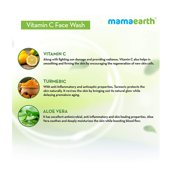 Mamaearth Vitamin C Face Wash with Vitamin C and Turmeric for Skin Illumination It also promotes collagen production and blood circulation to help repair skin, leaving it radiant and healthy. Perfect for daily use, this cleanser is suitable for all skin types and helps lock in moisture, reduce excess oil, and prevent free radical damage. This Vitamin C cleanser is dermatologically tested and free of harmful chemicals, toxins, parabens, and mineral oils.