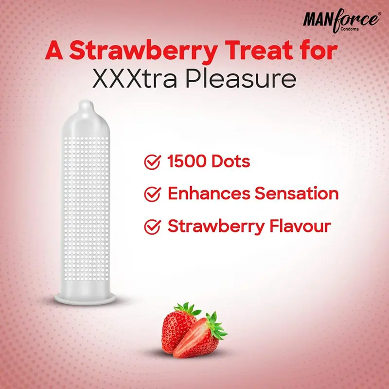 Experience a whole new level of pleasure with Manforce Strawberry Flavoured Premium Condoms. Indulge your senses with the enticing aroma and taste of juicy strawberries while enjoying safe and intimate moments with your partner. These condoms are designed to enhance your sexual experience with their dotted, contoured, ribbed texture providing heightened sensitivity and ultimate pleasure. With their delicious strawberry flavour, these premium condoms add a touch of excitement and playfulness to your intimate encounters. The extra dots on the outside of the condom further intensify sensations, making every moment more pleasurable. Manforce Strawberry Flavoured Premium Condoms are crafted with utmost care and attention to ensure maximum protection against unwanted pregnancies and sexually transmitted infections (STIs). Each condom undergoes rigorous quality testing to guarantee reliability and durability. Explore the world of pleasure without compromising on safety. Elevate your sexual experience with Manforce Strawberry Flavoured Premium Condoms and create unforgettable moments with your partner. Manforce Strawberry Flavoured Premium Condoms Features Lubricated 52 mm girth (+/- 2 mm) 100% electronically tested Natural latex rubber