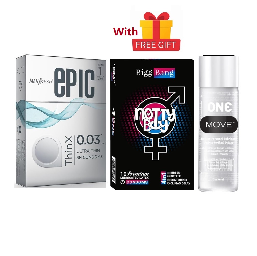 Manforce Shake Up Combo = 13Pcs Condom + Manforce Epic Thinx 003mm 3s + NottyBoy BiggBang 4in1 Ribbed, Climax Delay, Dots & Contour 10s + One Move Deluxe Lubricant Lube Gel 60ml + Free Gift