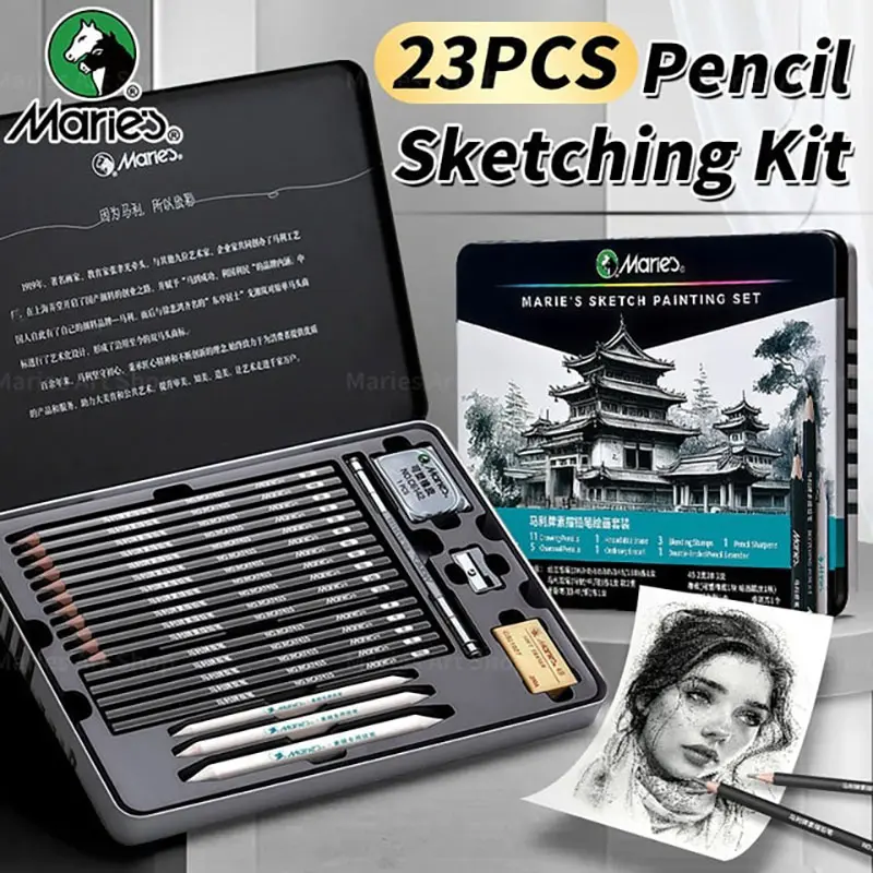 The Marie’s Sketch Painting Set (23 pcs) is designed to provide artists with the foundational tools needed for sketching, drawing, and creative practice. With a strong mix of graphite and charcoal pencils, plus blending and correction accessories, this set supports a variety of artistic techniques — from precise line work to rich shadowing and smooth blending. Its ergonomic pencil design offers comfort during prolonged use, making it a great choice for beginners, art students, and hobbyists alike.