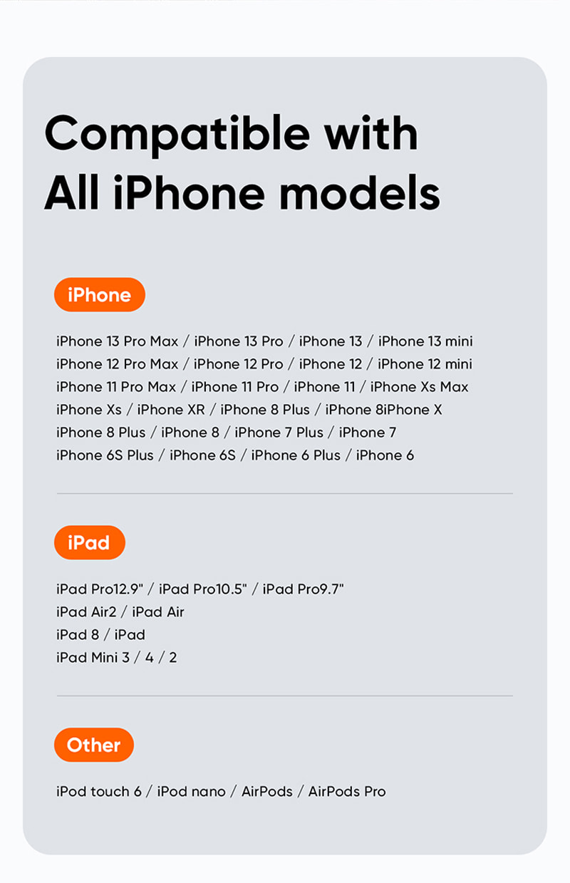 Compatible with ios system: Iphone 13/ 13 pro max/ 12 pro/ 13 mini/Iphone 12/ 12 pro max/ 12 pro/ 12 mini/ 11 / 11 pro max/ 11 pro/ X/ Xs/ Xr/ Xs max/ 8/ 7/ 6/ 8+/ 7+/ 6+/ 6s/ 6s+ Ipad pro 12.9/ Ipad pro 10.5/ Ipad pro 9.7/ Air 2/ Air/ Mini 3/ 4/ 2 Ipod touch 6/ Ipod nanao/ Airpods/ Airpods pro