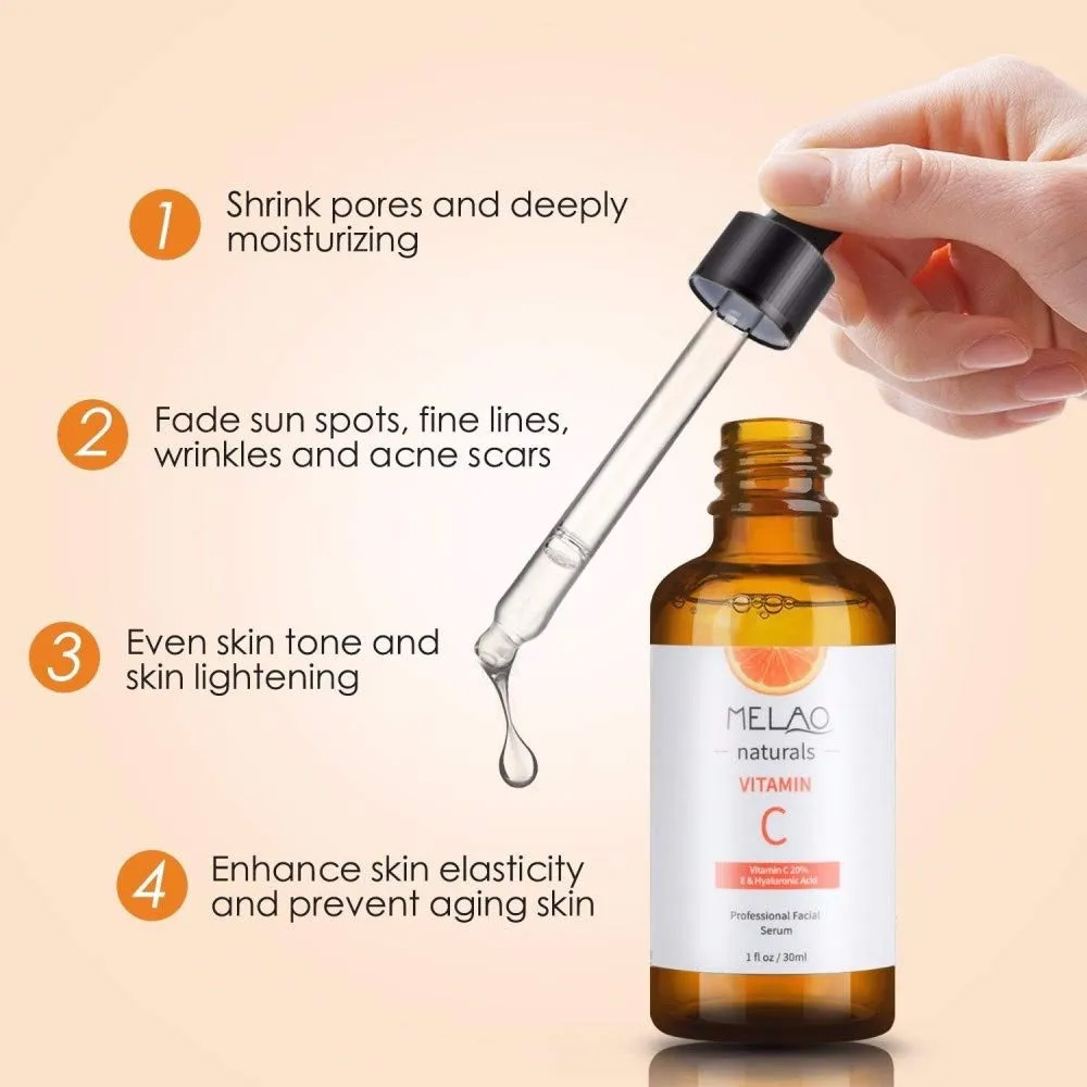 MELAO Naturals 20% Vitamin C Serum is a professional-grade facial serum formulated with high-quality active ingredients. This potent formula works deep within skin layers to deliver brightness, hydration, and youthful vitality.
