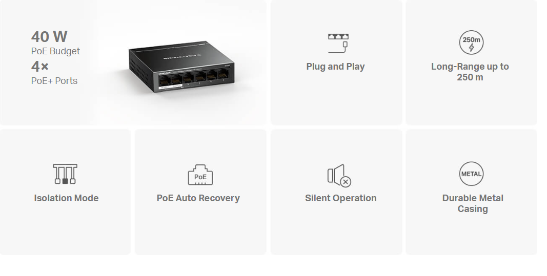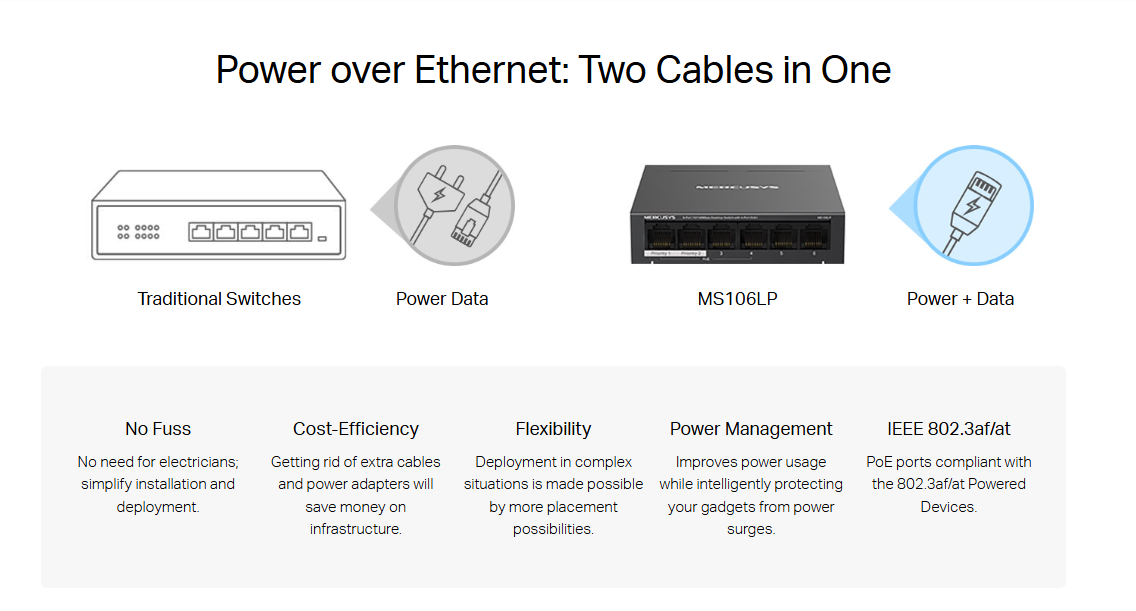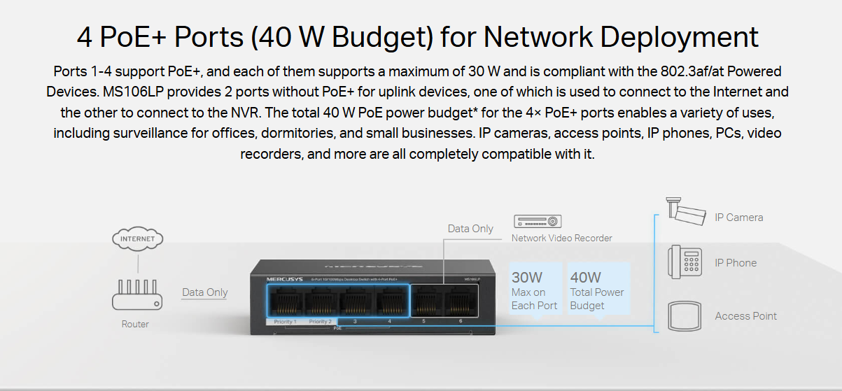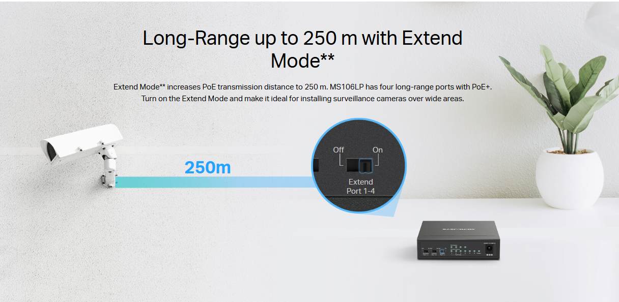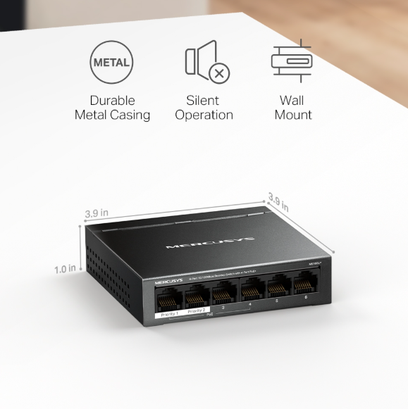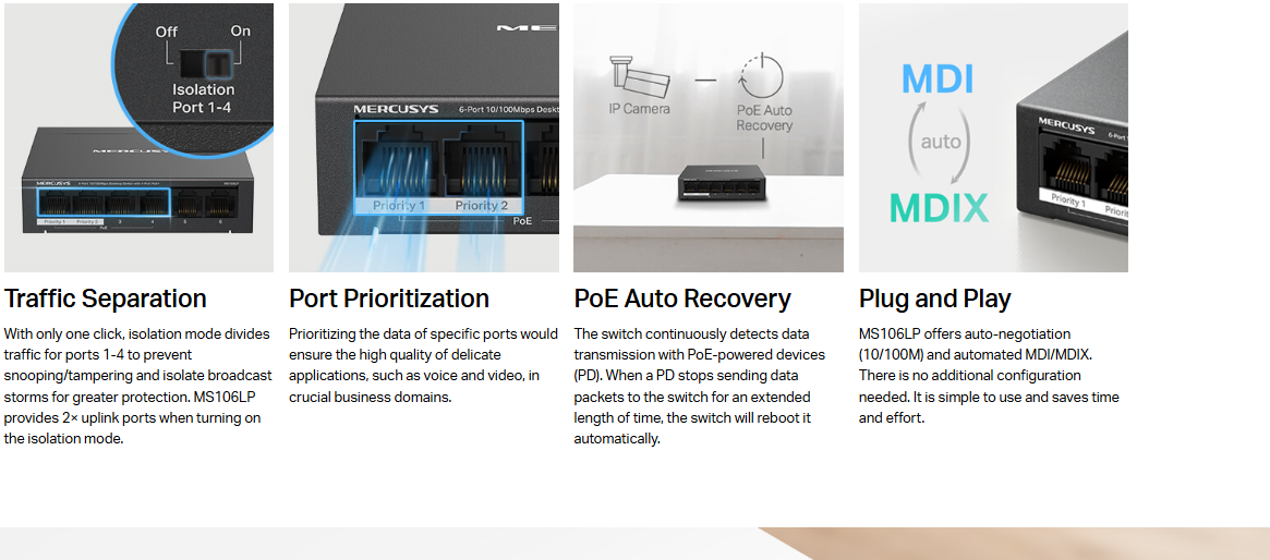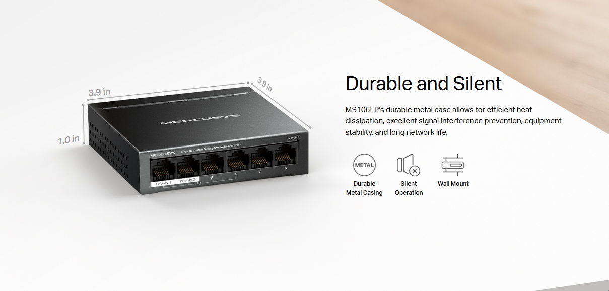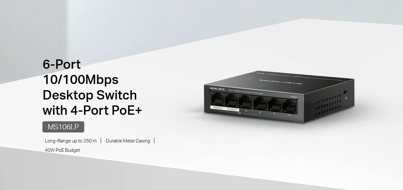 • 6-Port 10/100Mbps Desktop Switch with 4-Port PoE+ (MS106LP)