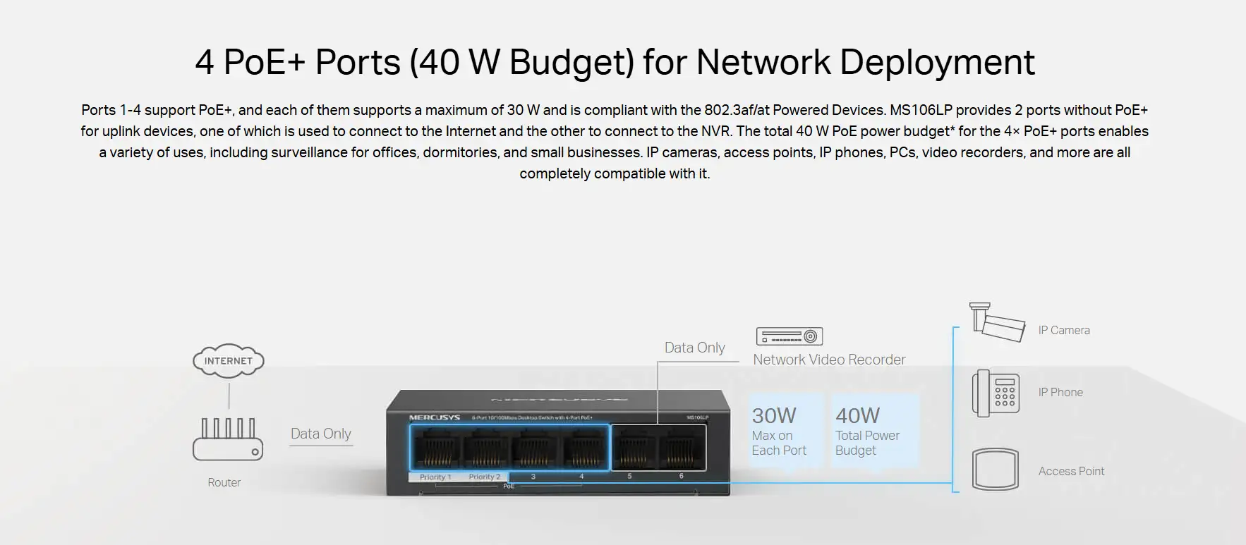 - 6 Ports: 6× 10/100 Mbps RJ45 ports with 4 PoE+ ports