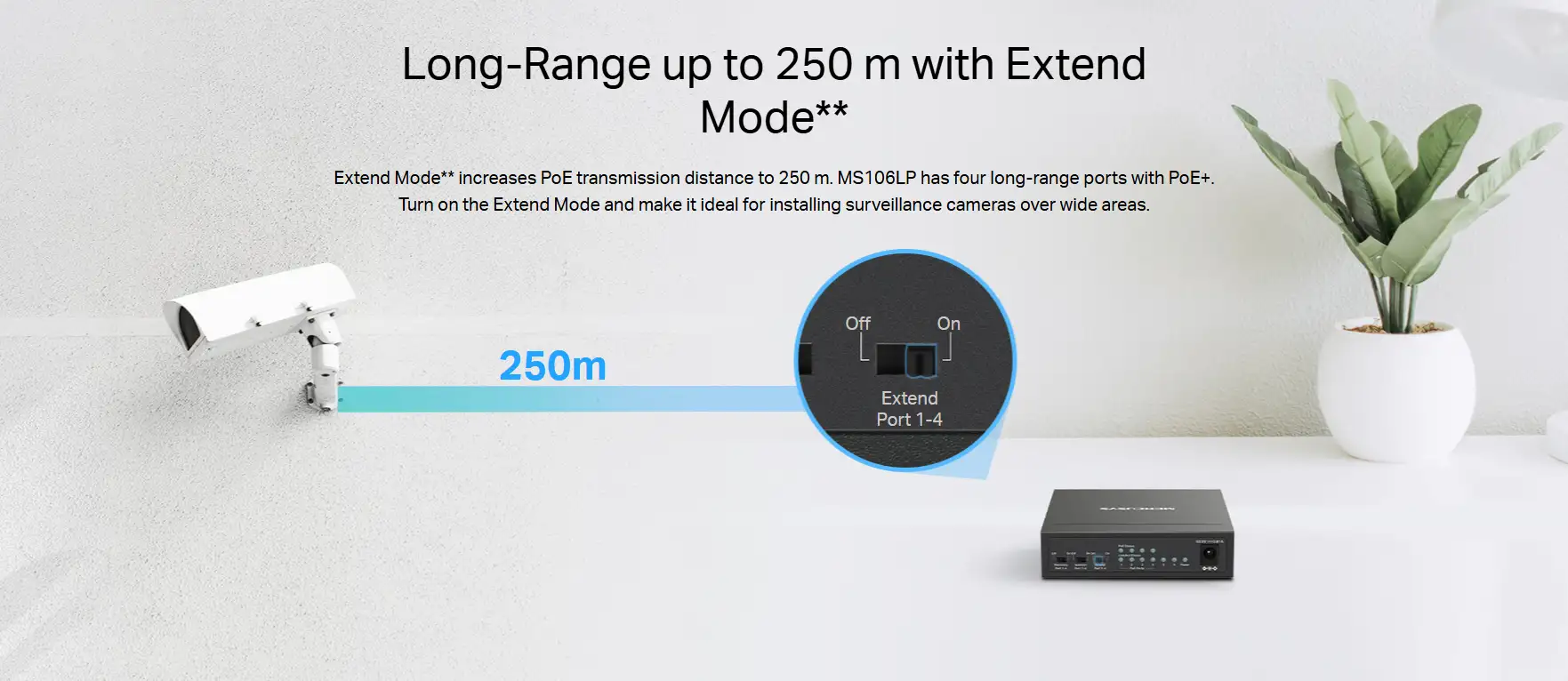 - Long-Range up to 250 m: Increases PoE transmission distance to 250 m by Extend Mode*