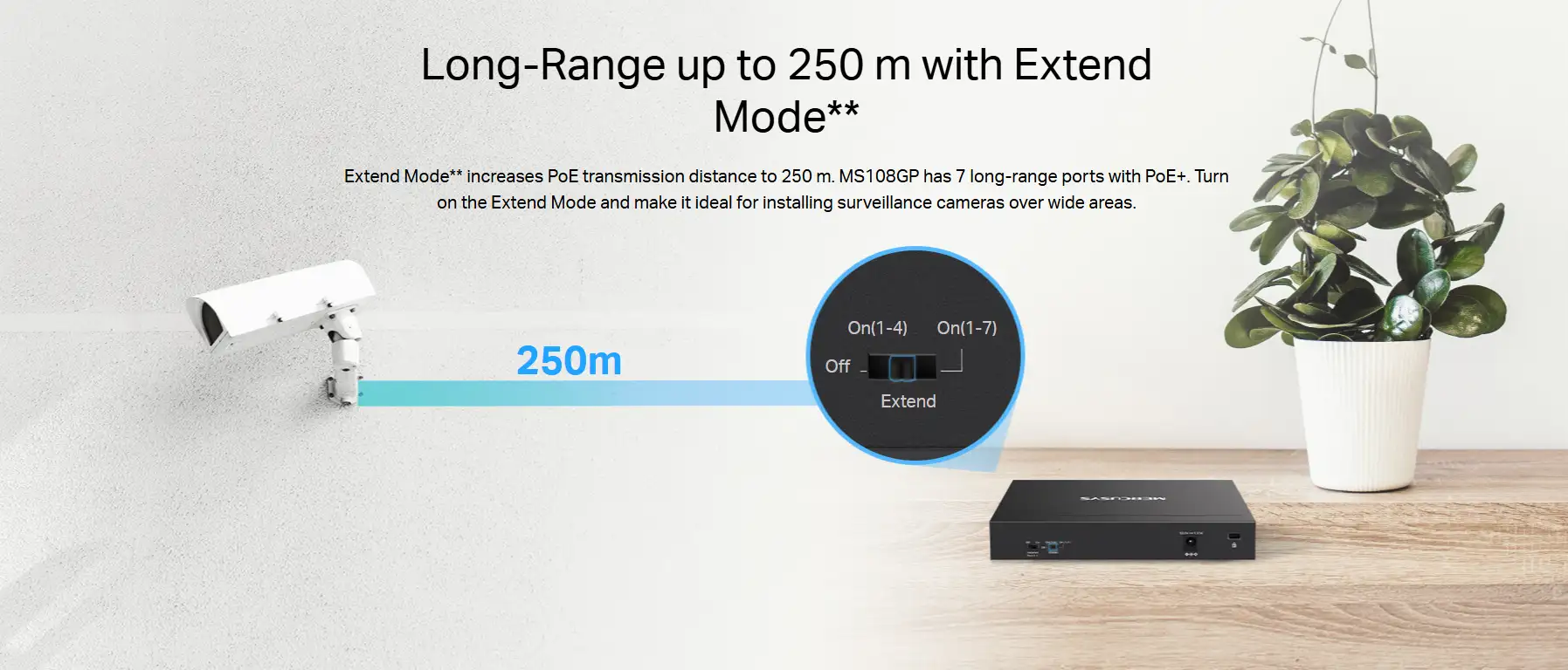 - Extended PoE Reach: The Extend Mode allows for PoE transmission distances of up to 250 meters. This is a significant advantage compared to standard PoE which reaches around 100 meters. This makes the MS108GP ideal for scenarios where devices need to be positioned further away from the switch, like outdoor security cameras or access points in large buildings.