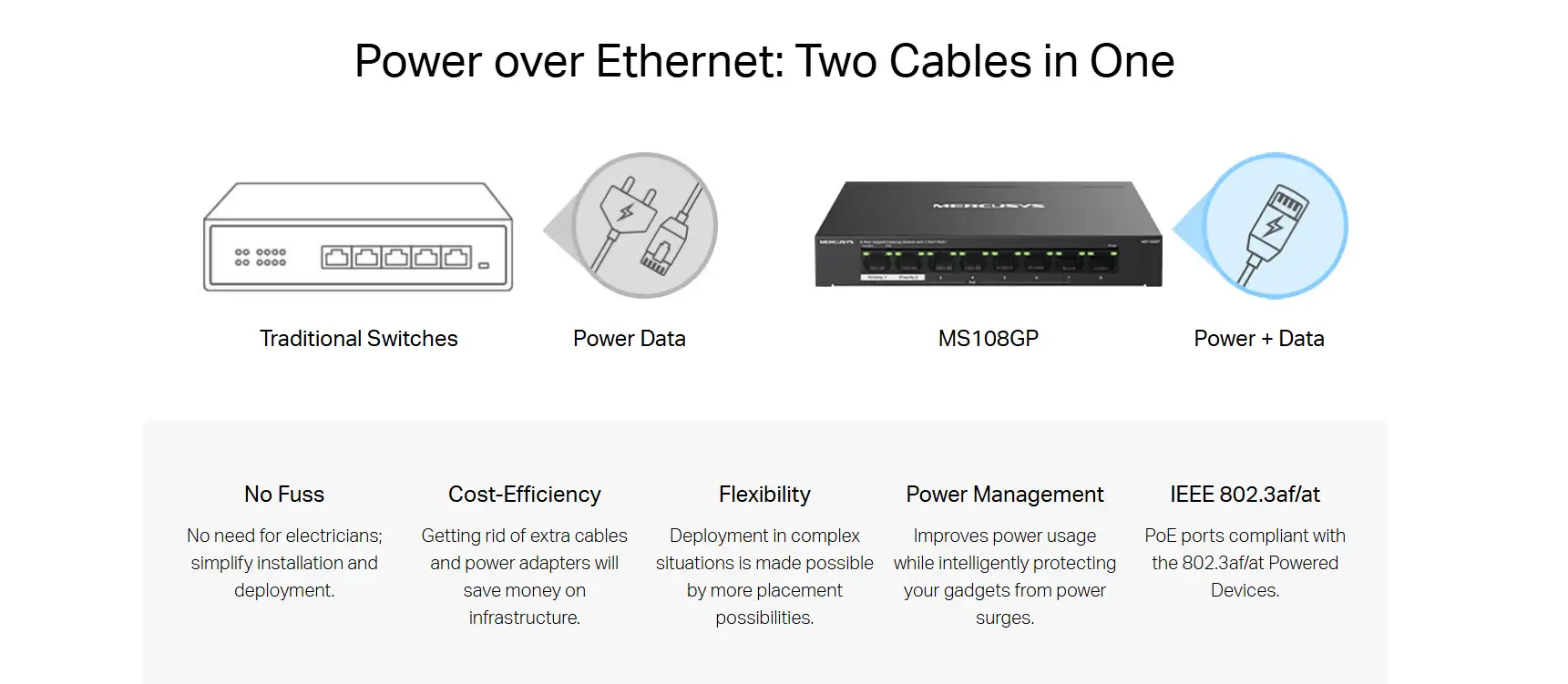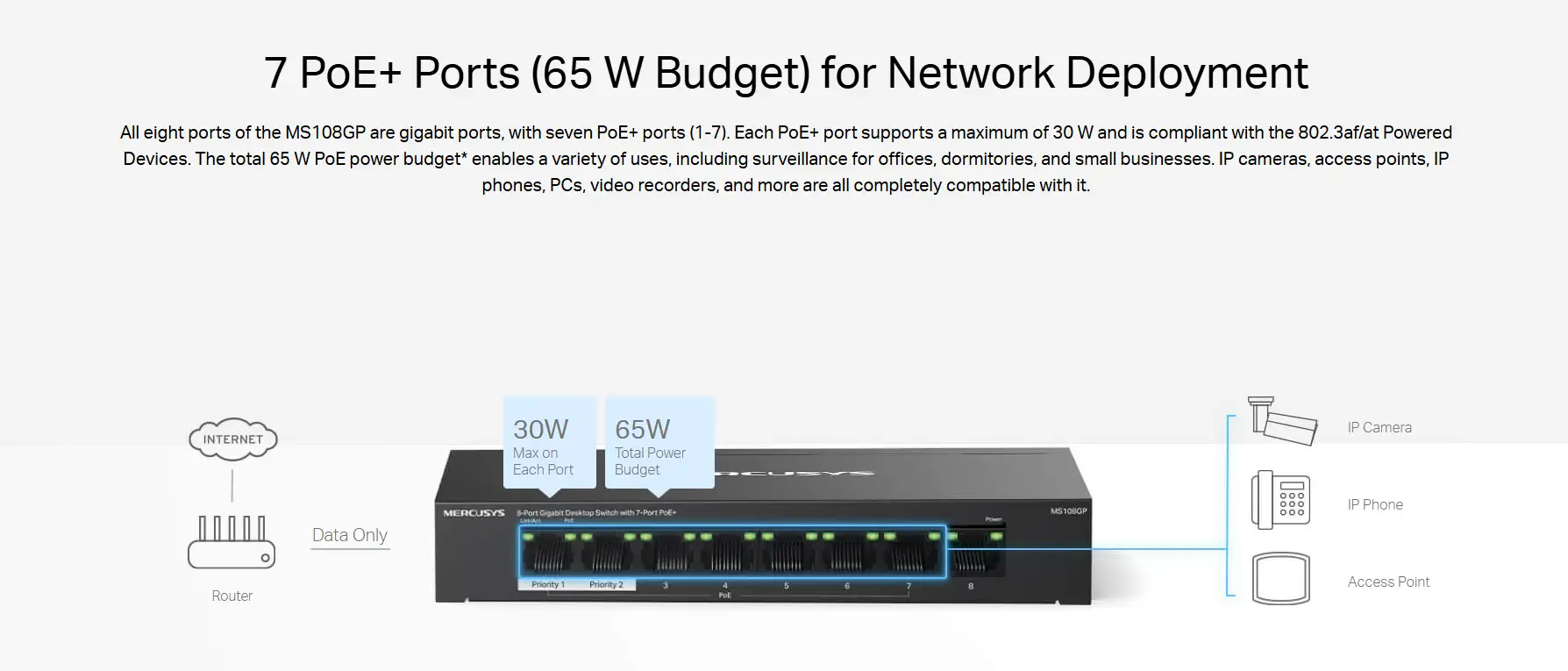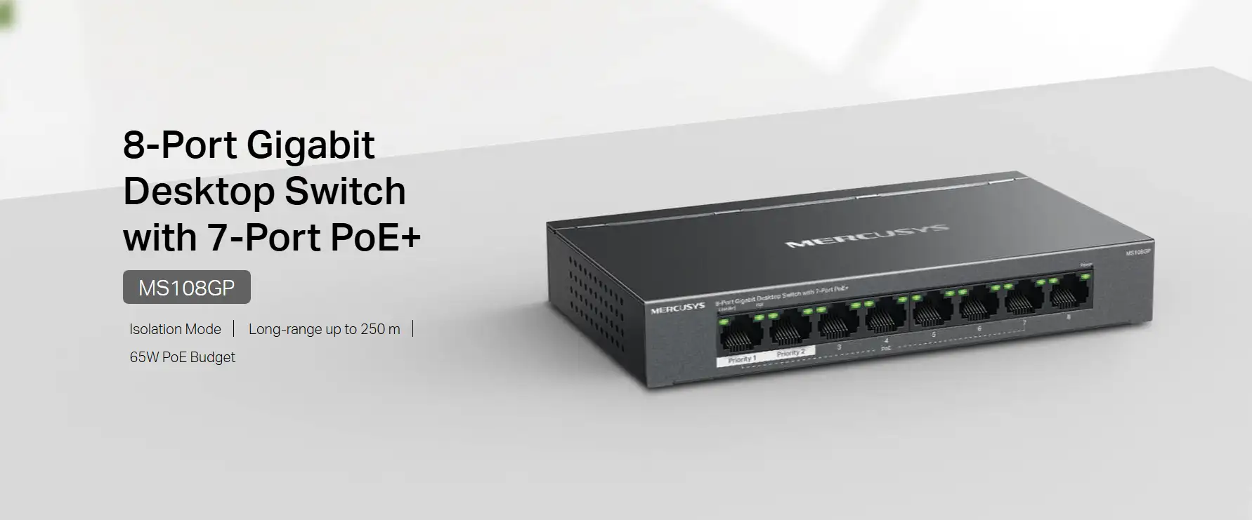 The Mercusys MS108GP is an 8-port Gigabit desktop switch with 7 of the ports supporting Power over Ethernet (PoE+). This means it can deliver data and power over a single Ethernet cable to compatible devices, such as IP cameras, VoIP phones, and access points. This eliminates the need for a separate power supply for these devices, making installation easier and more flexible.
