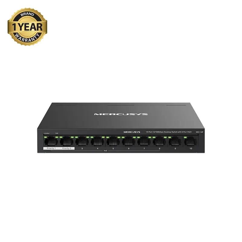 10 Ports: 10× 10/100 Mbps RJ45 ports with 8 PoE+ ports
