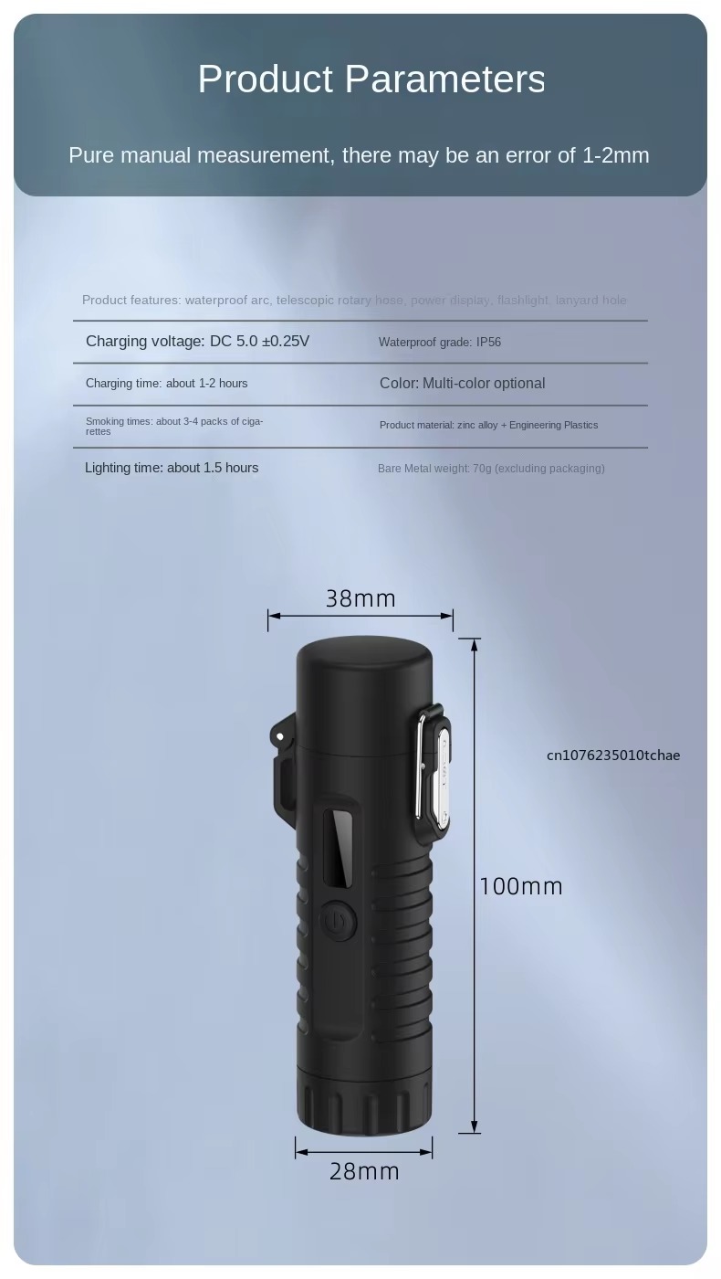 ক্যাম্পিং, ভ্রমণ বা দৈনন্দিন ব্যবহারের জন্য এটি একটি নির্ভরযোগ্য, টেকসই ও মাল্টিফাংশনাল লাইটার। উইন্ডপ্রুফ ডুয়াল আর্ক এবং ফাস্ট চার্জিং সুবিধা এটিকে একটি আধুনিক ও কার্যকরী গ্যাজেট করে তোলে।