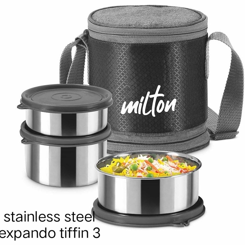 Color: MULTI; Material: Stainless Steel; Package Content: 1 - Piece Expando 2+1 Lunch Box (3 Containers - 320 ml, 320 ml, 500 ml); Dimension in cms (L x W x H): 14 x 14 x 17