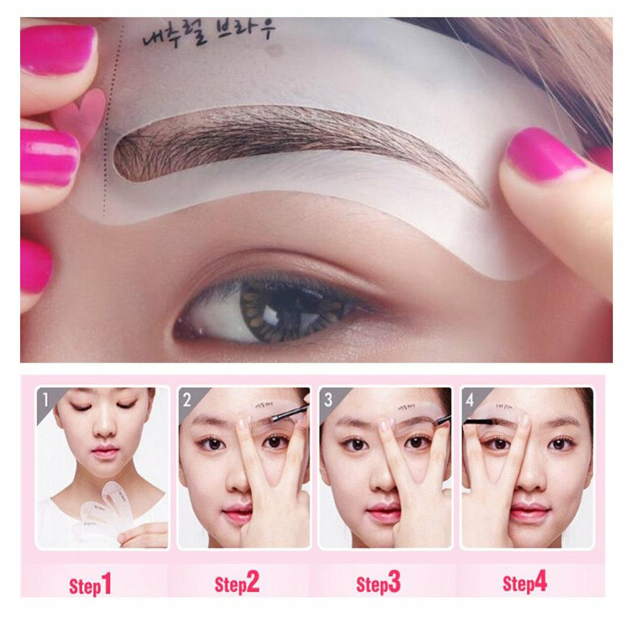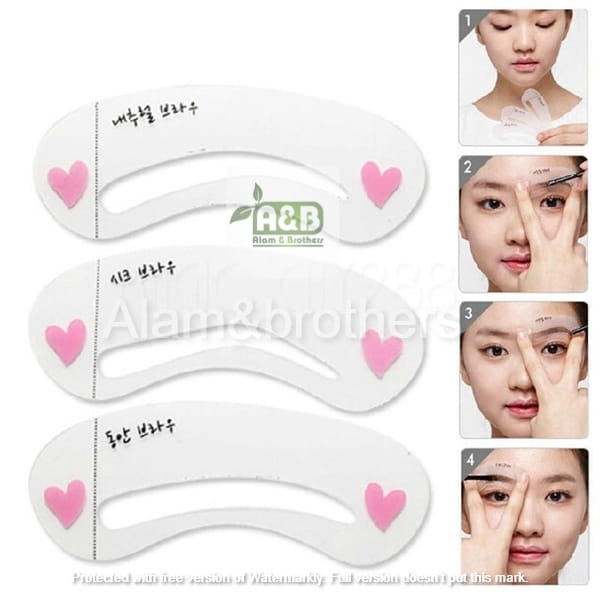 - These three brow drawing stencils allow you to achieve there different looks with three different brow shapes that easily help you find your ideal frame.[Direction]1. Neatly organize eyebrow hair with brow brush.2. Choose which Drawing Guide to use according to desired style.3. Align dotted line with natural start and end points of eyebrows and press onto face by placing thumb and index finger onto Drawing Guide's heart shapes. Fill in half of brow.4. Re-align Drawing Guide to eyebrow ends and fill in remaining brow.5. Repeat 1-4 onto opposite eyebrow.
