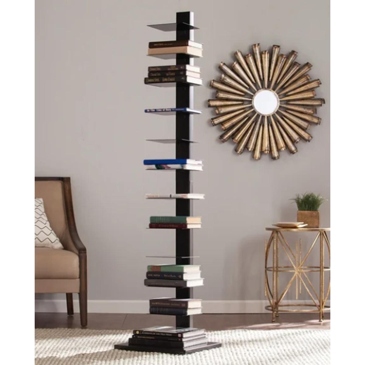 Stack your favorite books, DVDs, and more with this attractive vertical shelf. The airy design keeps the profile looking modern, while a black finish blends easily with neutral room palettes for effortless decor matching. Sturdy metal construction ensures this beautifully designed shelf is built to last. Features: Includes 1 tower shelf Minimalist, contemporary look Made of powder-coated tube and sheet metal Black finish 12 shelves Each shelf supports up to 9 pounds Shelves flip up for easy fitting of larger books Durable metal construction Slim profile creates space-saving design Contemporary style Assembly required Dimensions: Overall: 65.25 inches high x 15.75 inches wide x 16 inches deep Shelves: 5.25/ 5.5 inches high x 8 inches wide x 6.75 inches deep (every other shelf) Bottom shelf: 5.75 inches high x 15.75 inches wide x 13.75 inches deep Footprint: 15.75 inches wide x 16 inches deep Overall weight: 29 pounds Items with anti-tipping hardware restraints must be secured to the wall. Please contact the manufacturer immediately if anti-tip hardware is not included