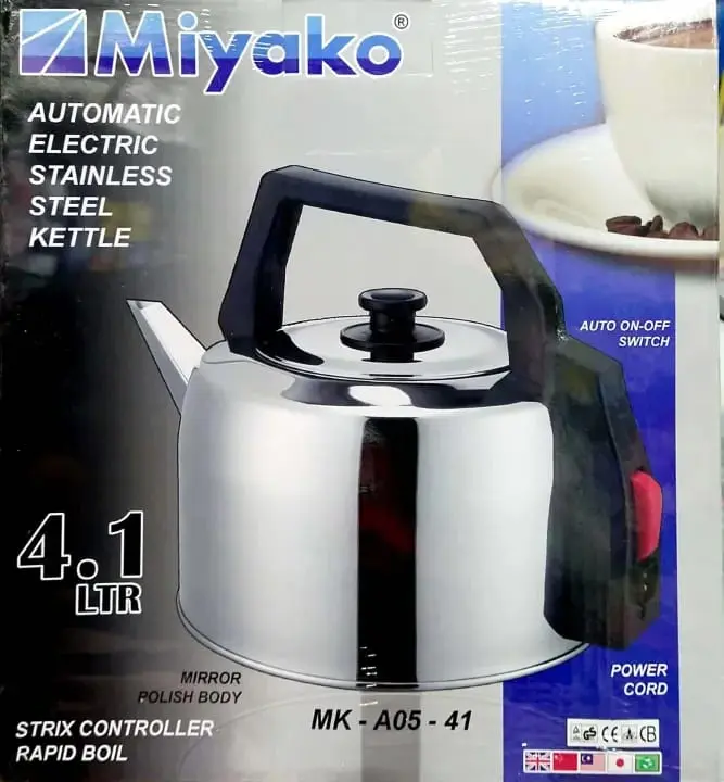 The product in the image is the Miyako Automatic Electric Steel Kettle with the model number MK-A05-41.